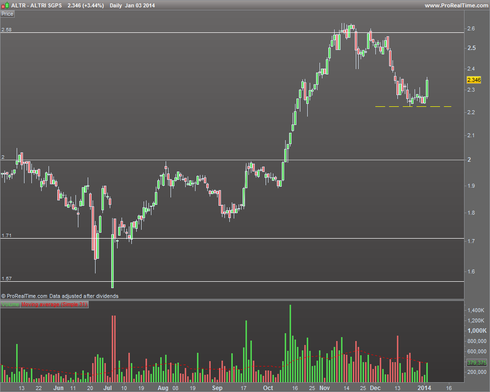 A Altri é uma ação que tem por hábito arrancar violentamente. Já a tinha acompanhado desde o final de 2012, em mais um desses arranques (70% em meio ano!) abandonando-a naquilo que agora reconheço ter sido o período de consolidação de 2013, entre os 1,7 e os 2€. Fiquei a aguardar a quebra dos 2€ como sinal para entrar novamente, mas nova tirada de 30% com velas vermelhas que se contam pelos dedos de uma mão inviabilizaram a entrada. A ação corrigiu agora cerca de 50% destas subidas e acabou por estabilizar, aparentemente na zona dos 2,2x. A vela de sexta-feira sugere inversão no muito curto prazo prazo e escaldado pelo último movimento prefiro arriscar a entrada na segunda-feira do que ficar à espera de uma correção que pode nunca vir.