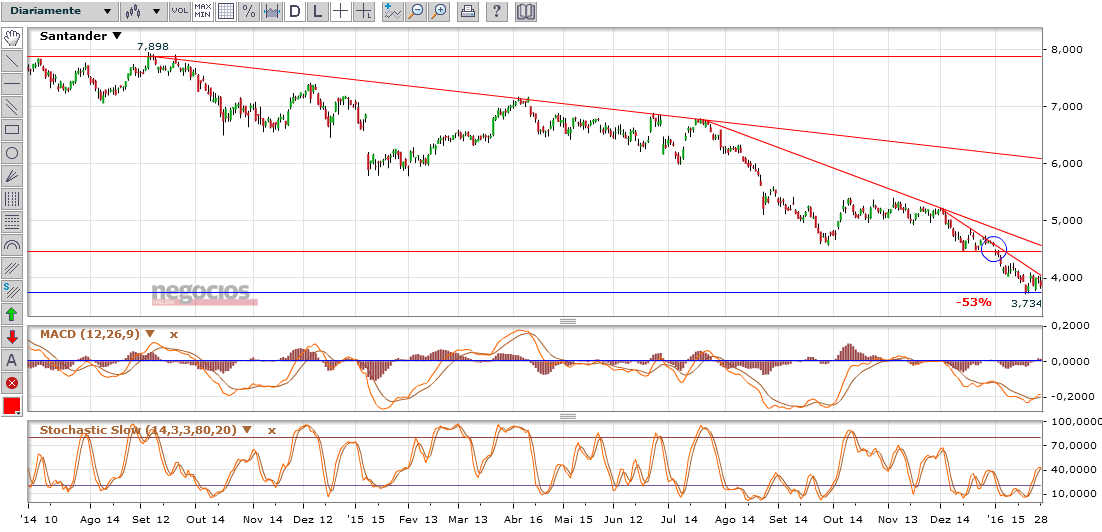 As acções, como tudo na vida movem-se por ciclos, e o ciclo de queda das acções do SANTANDER está aproximar-se do fim, talvez mais uns seis meses e as acções estarão próximas dos 3€uros, um preço que em principio será muito apetecível pois o Banco até ver é um dos mais sólidos da Europa.