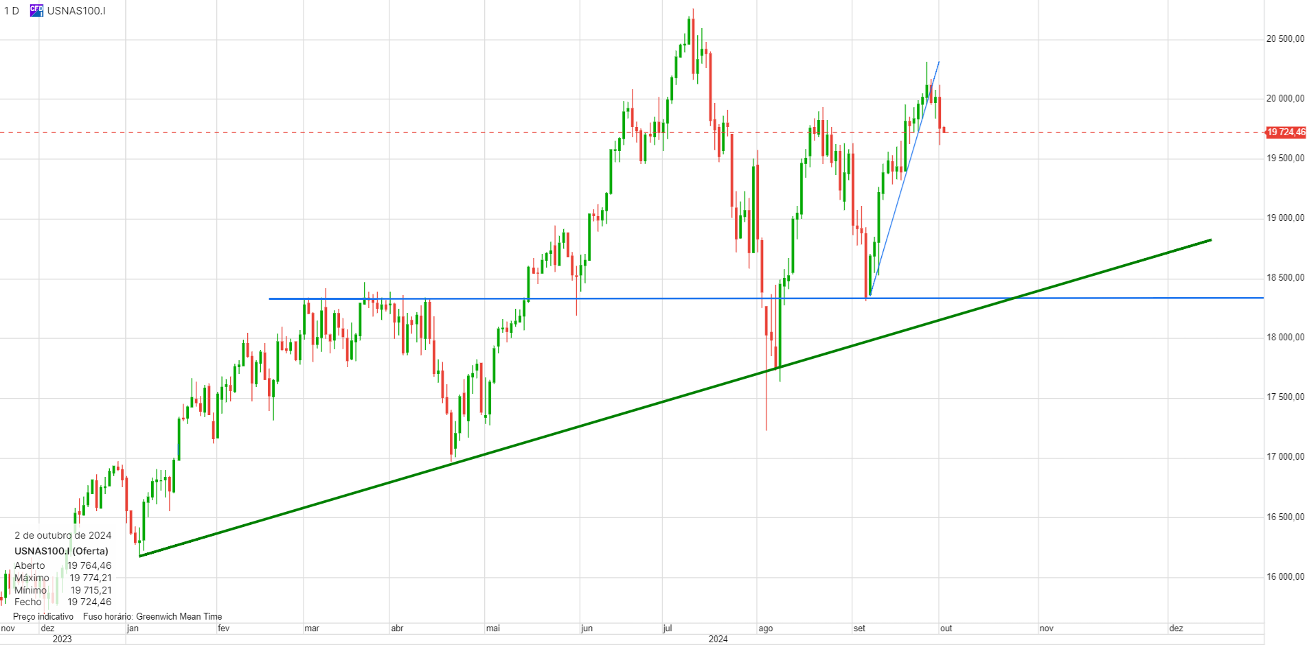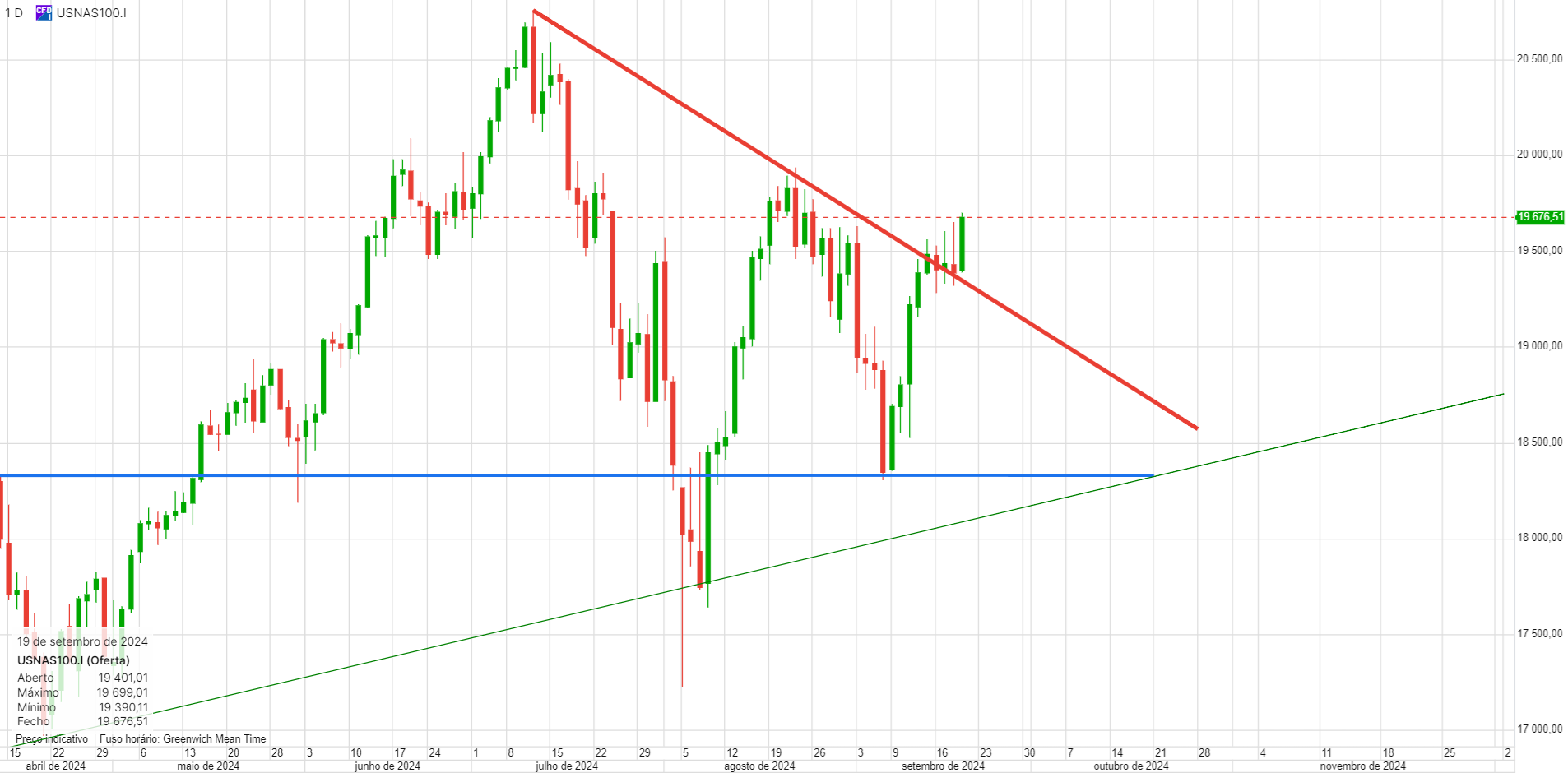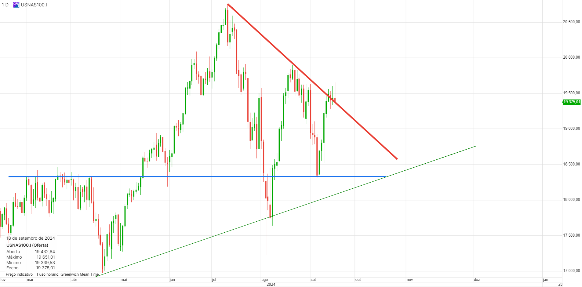 Longo até aos 19300, onde a linha descendente a azul está a limitar o preço.
