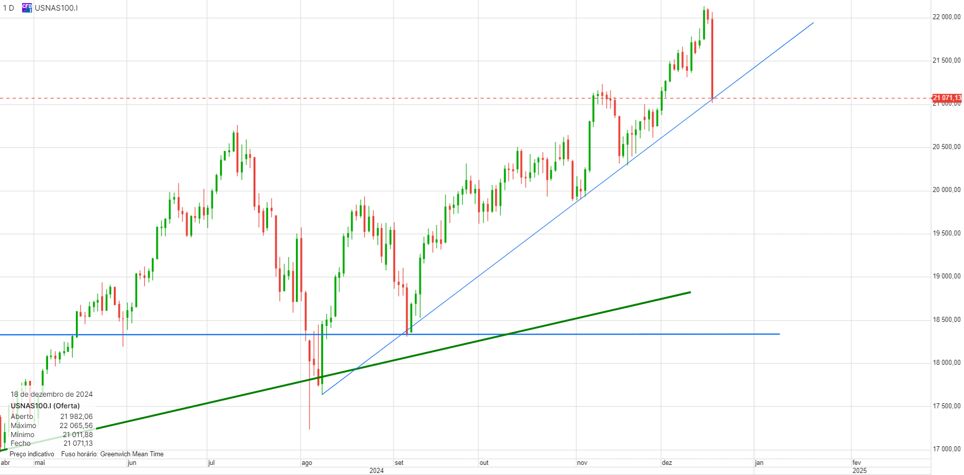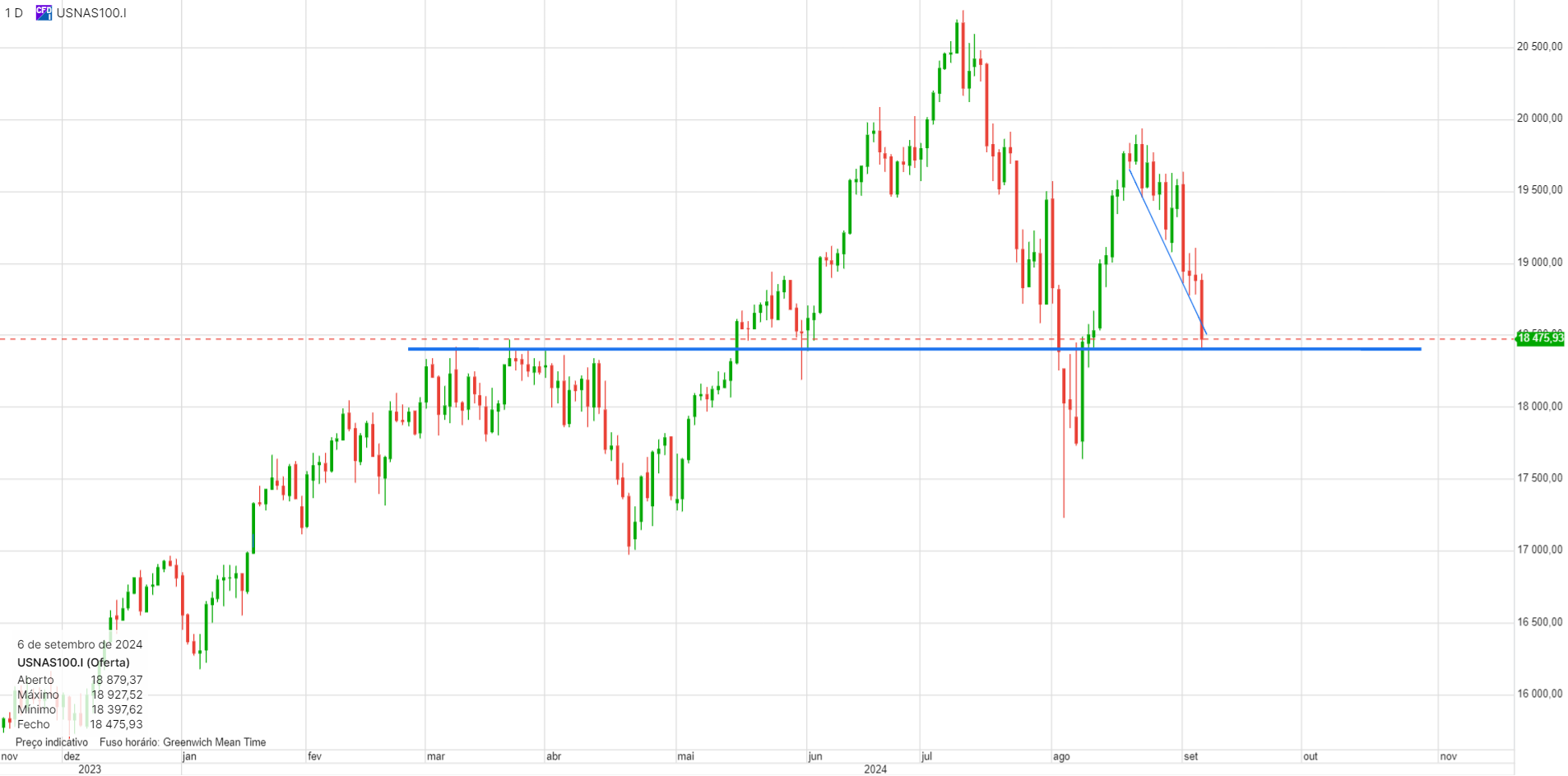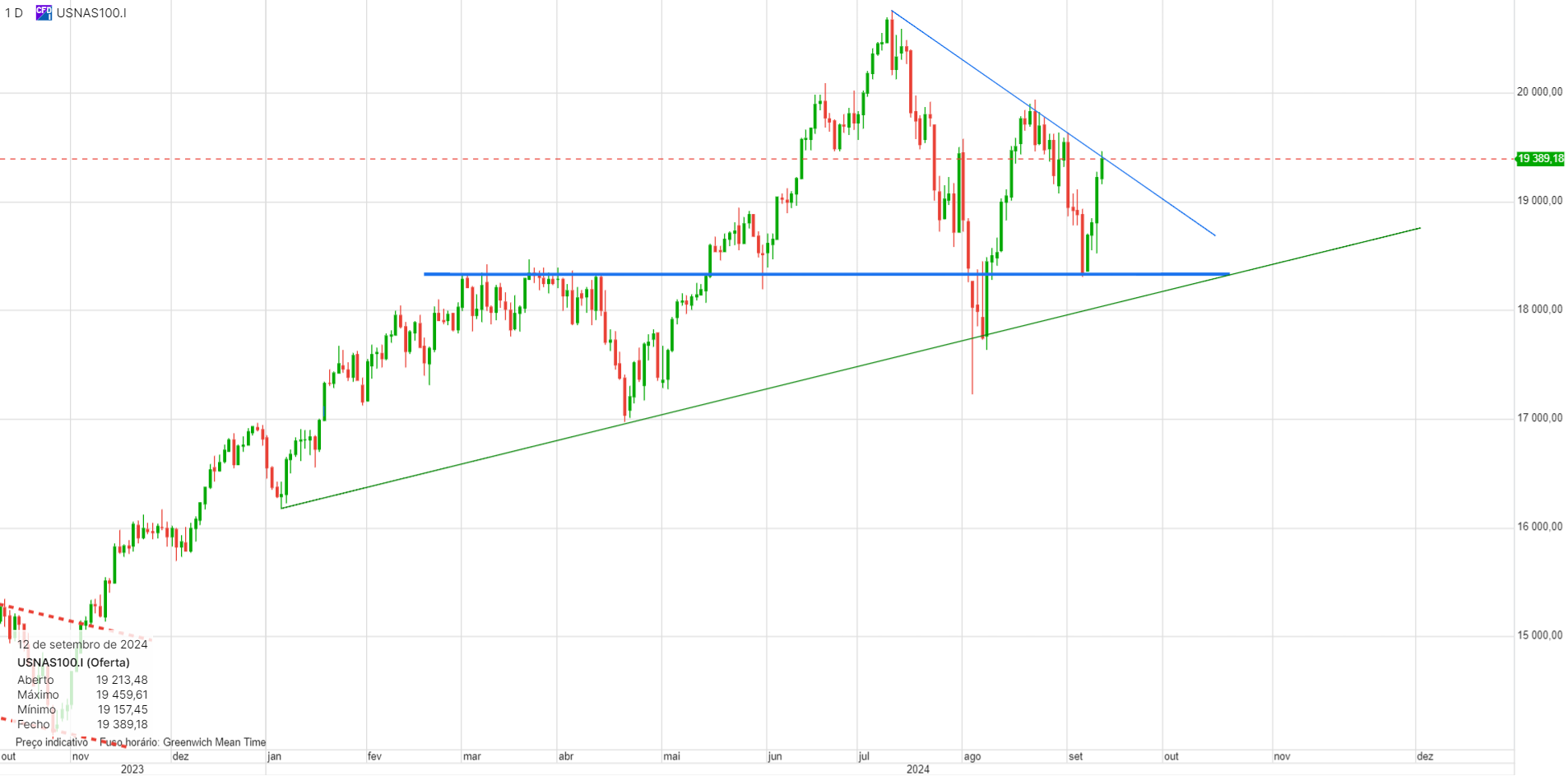 Longo até aos 19300, onde a linha descendente a azul está a limitar o preço.
