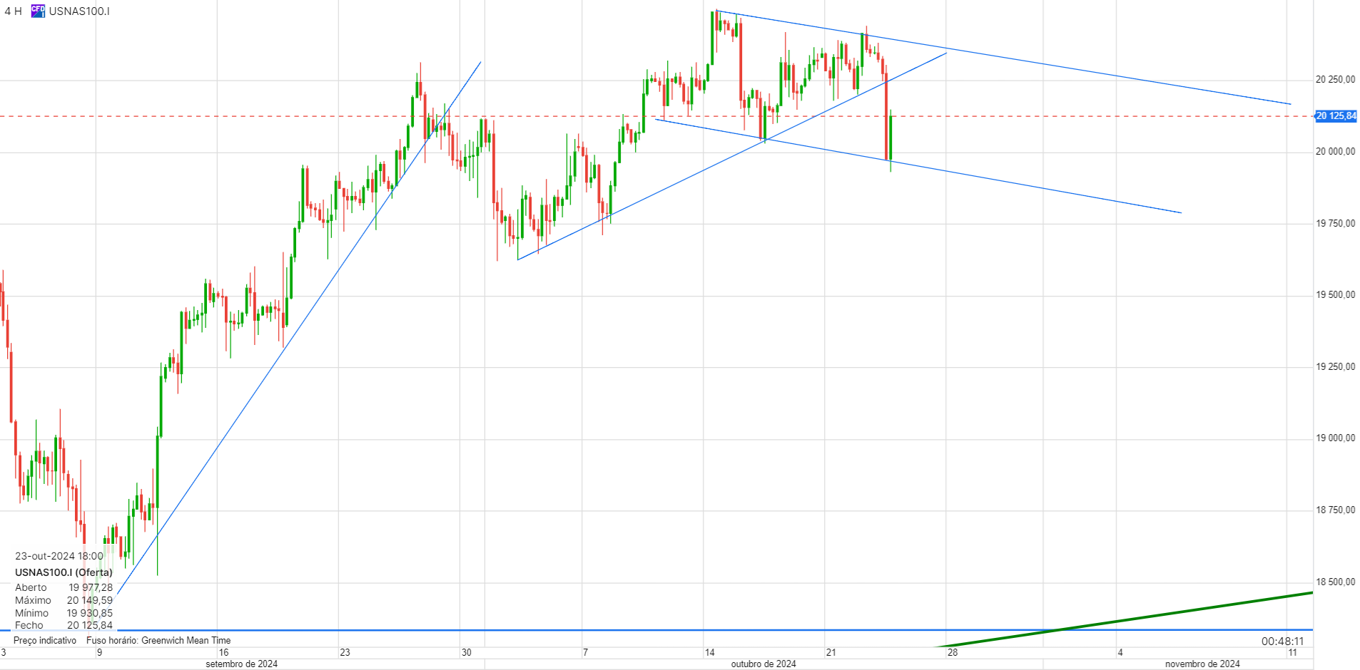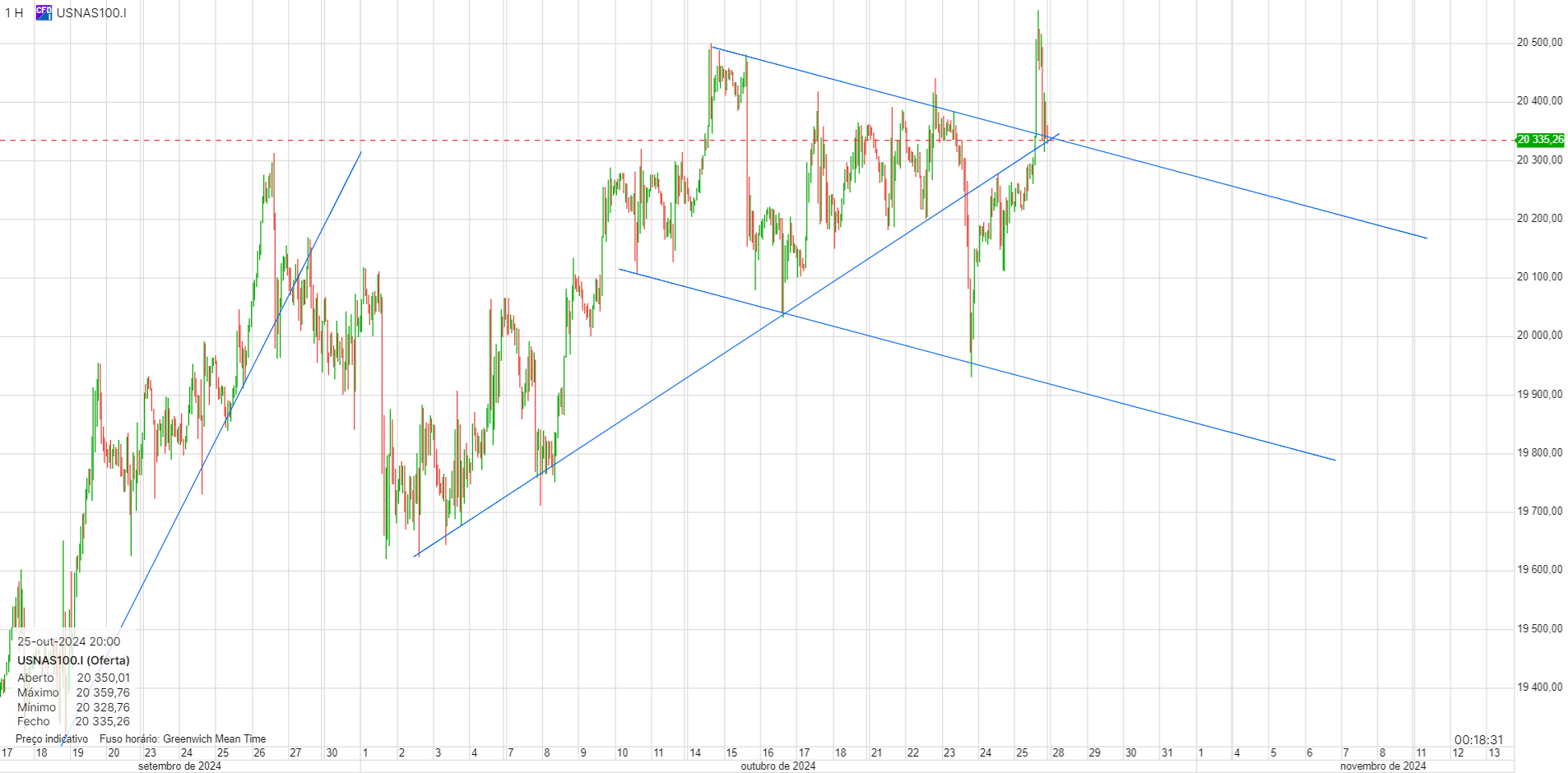 Neste momento estou a negociar o canal descendente, no gráfico de 4 horas. Fechei hoje uns curtos que tinha e abri uns longos a 20020, para vender na zona dos 20300/20350.