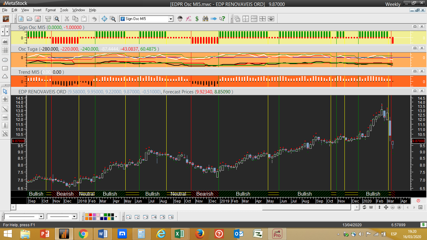 O gráfico escolhido para hoje foi o da EDP Renováveis. Nos tempos que correm é difícil ver indicadores positivos a consolidarem-se, no entanto a EDP-R contraria pela positiva essa constatação. No gráfico diário pode-se observar que a sua força tendencial sobe de 60% na véspera para 90%. Um bom augúrio para este papel comprado na carteira.