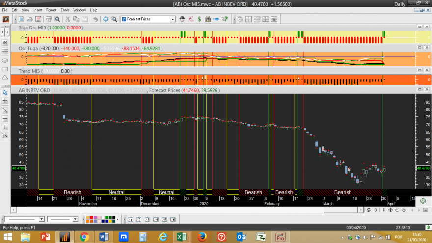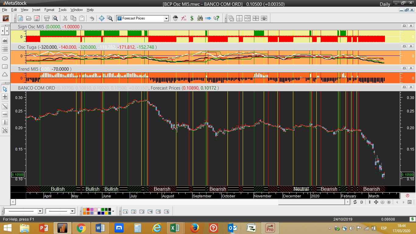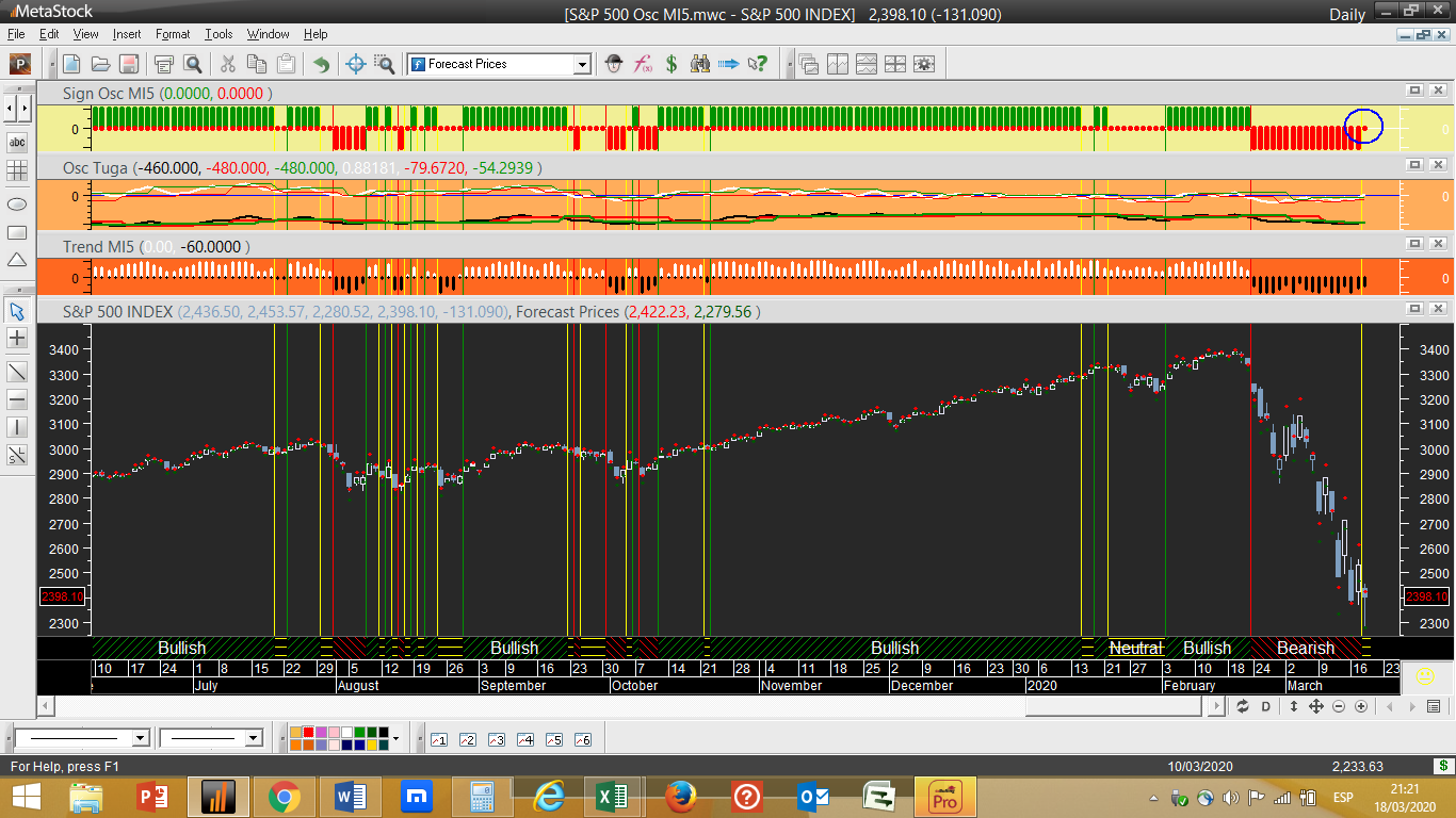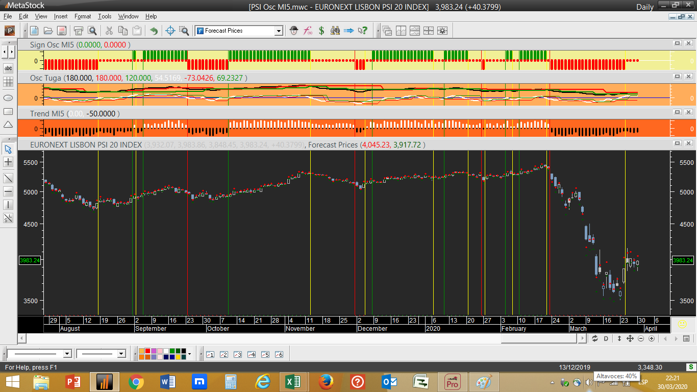 No que respeita ao diagnóstico do fim do dia do sistema de trading, parece que finalmente começamos a ter um início tímido de alguns sinais positivos, não para comprar ainda mas sim para o fecho de posições curtas, através da inversão de condições na escala diária. As referidas posições vendidas na sua maioria provinham de sinais disparados pelo programa durante a segunda quinzena de fevereiro: