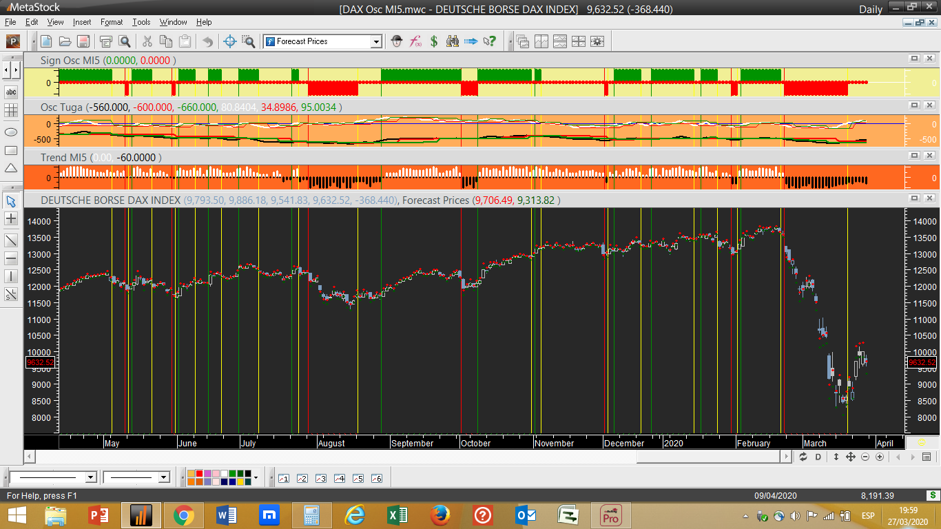 O gráfico do dia foi hoje o do DAX, devido à sua forte valorização. É certo que o ciclo de trading descendente diário terá sido interrompido mas a sua força da tendência diária melhorou apenas de -60% para -50%. Na escala semanal ambos os indicadores continuam negativos pelo que no diagnóstico geral a sua posição continua vendedora, incluindo a tendência com uma força diagnosticada de -80%.