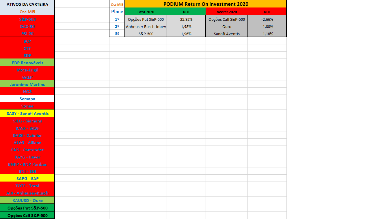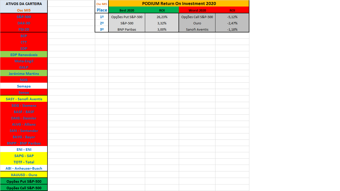 Por fim fica também a imagem do quadro com o resumo das posições aconselhadas pelo sistema de trading e o podium semanal actualizado com as rentabilidades YTD ou ROI dos melhores e piores papéis da carteira ao longo do ano de 2020.