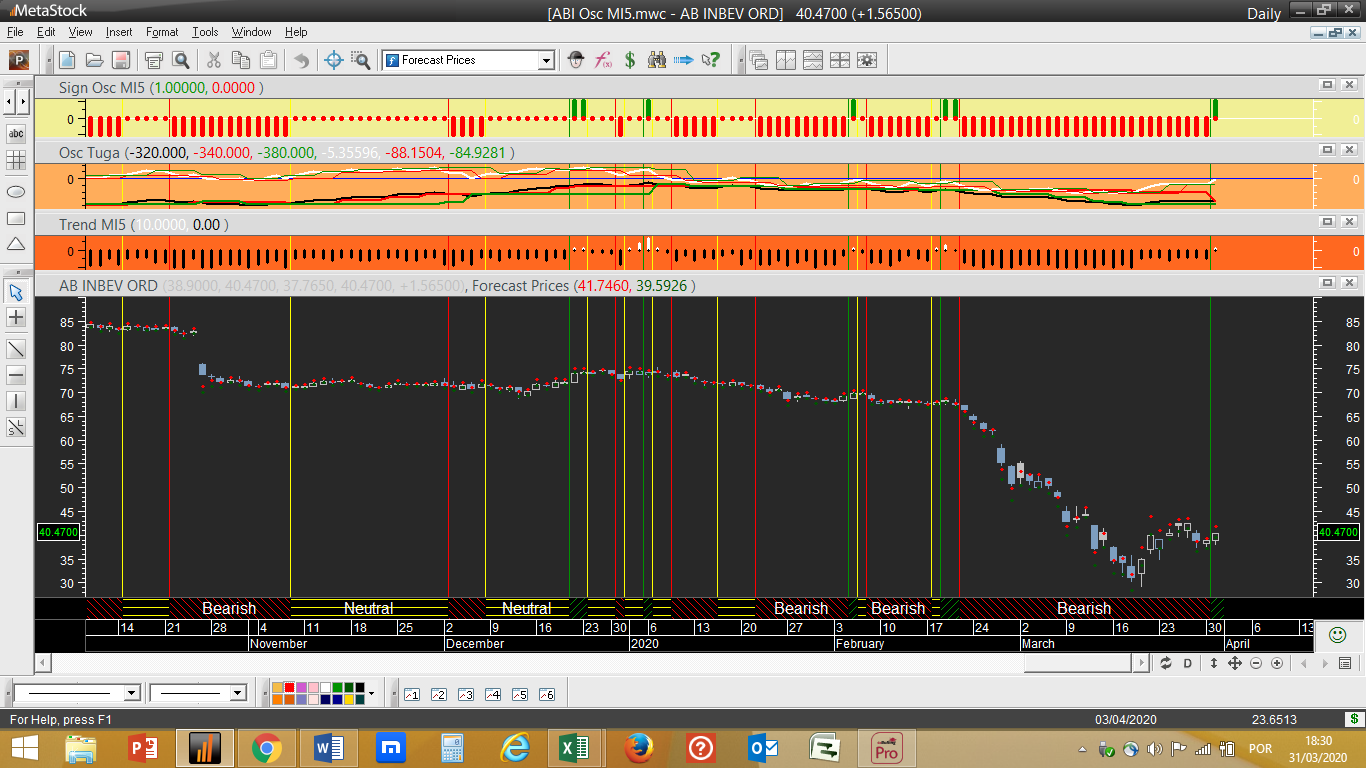 Anheuser Busch Inbev – Passa de vendida a neutral. Ver gráfico abaixo, onde na escala diária tanto o ciclo de trading como a tendência apresentam finalmente um panorama mais luminoso, em contraste com o negativismo que ainda se vai mantendo no timing semanal.