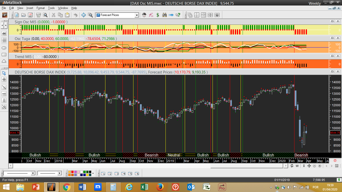 O gráfico do dia representa o DAX na sua escala semanal, onde por enquanto se constata sem grandes surpresas que quer o ciclo de trading quer a tendência se vão mantendo descendentes.