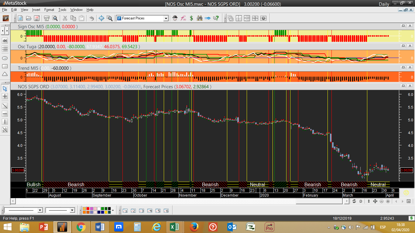 A NOS foi o gráfico escolhido para hoje. À semelhança da maioria das restantes acções todos os indicadores essenciais encontram-se num plano descendente excepto o seu ciclo de trading diário que se vai mantendo neutro por enquanto. No cômputo geral continua portanto e por enquanto vendida.