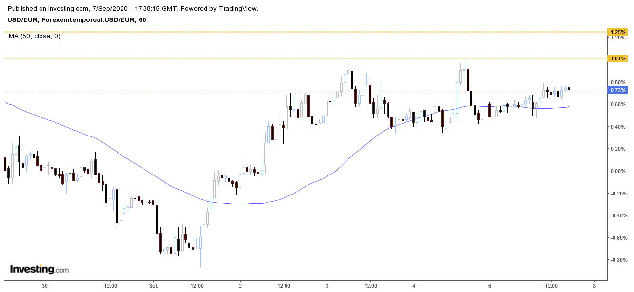 Ainda assim, a subida do dólar nem sequer é impressionante, pois o EUR/USD a 1.1850 está apenas a pouco mais de 1% abaixo dos máximos recentes.