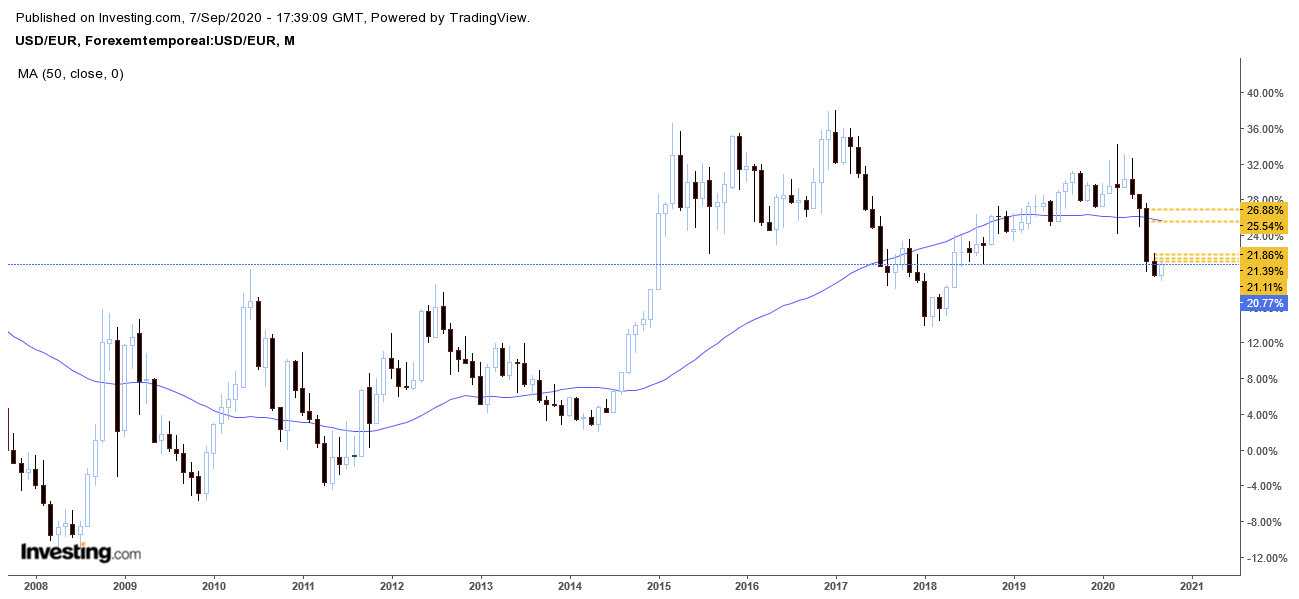 Vale a pena lembrar que no último grande "bull" do EUR/USD o par teve dificuldade ali entre 1.17 e 1.20 - mas depois foi a explosão total até 1.30 com poucas paragens pelo meio. Isto ocorreu em 2003 e levou apenas dois meses...