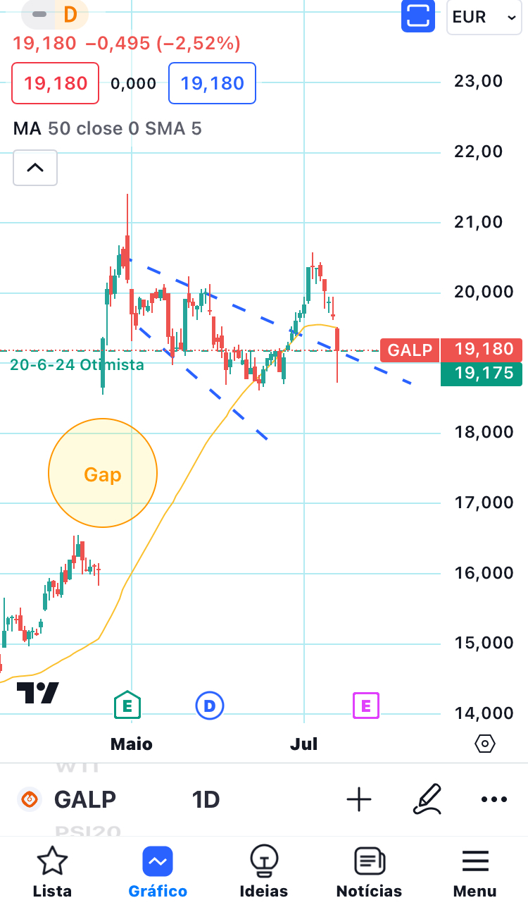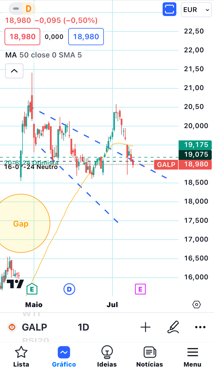 A Galp desceu hoje, mas também não parece estar com muita vontade de descer, porque recuperou na quinta feira parte do que desceu nesse dia e hoje desceu pouco. Acho que é mais provável que ela suba e não desça para fechar o gap, mas por causa do gap acho arriscada e por isso preferi dizer que ficava neutro.