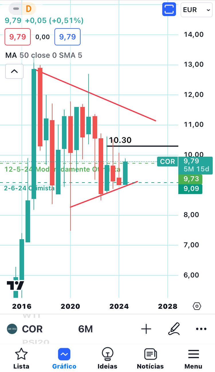 Mudei de moderadamente otimista para otimista na Corticeira Amorim. Com a descida do mês passado, ficou próxima da linha vermelha de baixo, que penso poder funcionar como suporte.