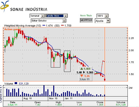 Ao estudar o gráfico da Sonae Indústria deparei-me com dois possíveis pontos de entrada que acabaram por não resultar da forma esperada.