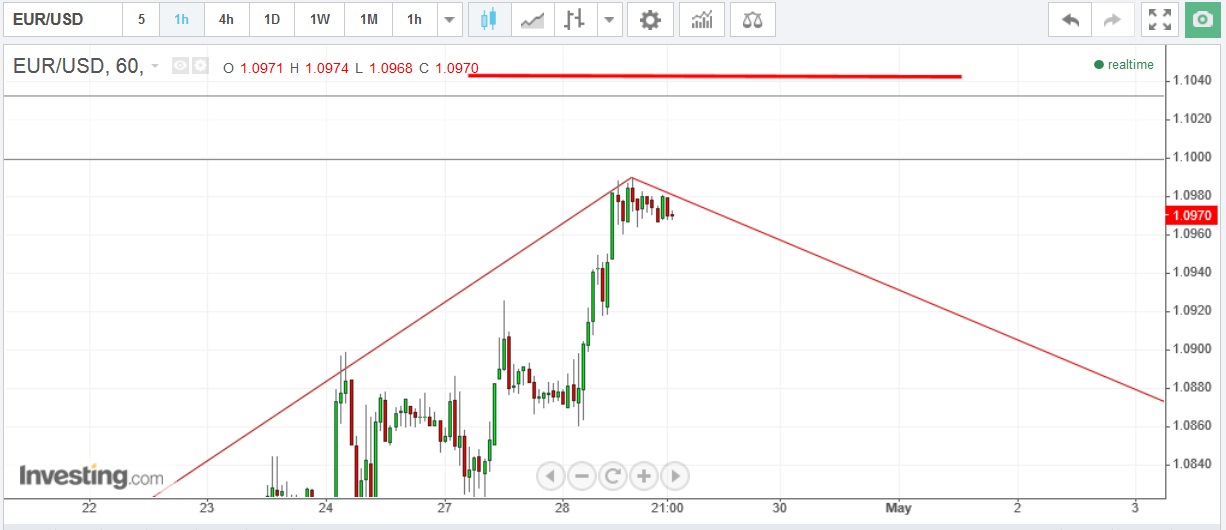 p.s.s. as linhas a tracejado (resistência no 1,10 e linha de pivots) poderão eventualmente ajudar a explicar o porquê de se ter formado (ou a acabar de formar) a bear flag precisamente nesta zona de intersecção das referidas linhas - indecisão provisória quanto ao rumo do preço (?).