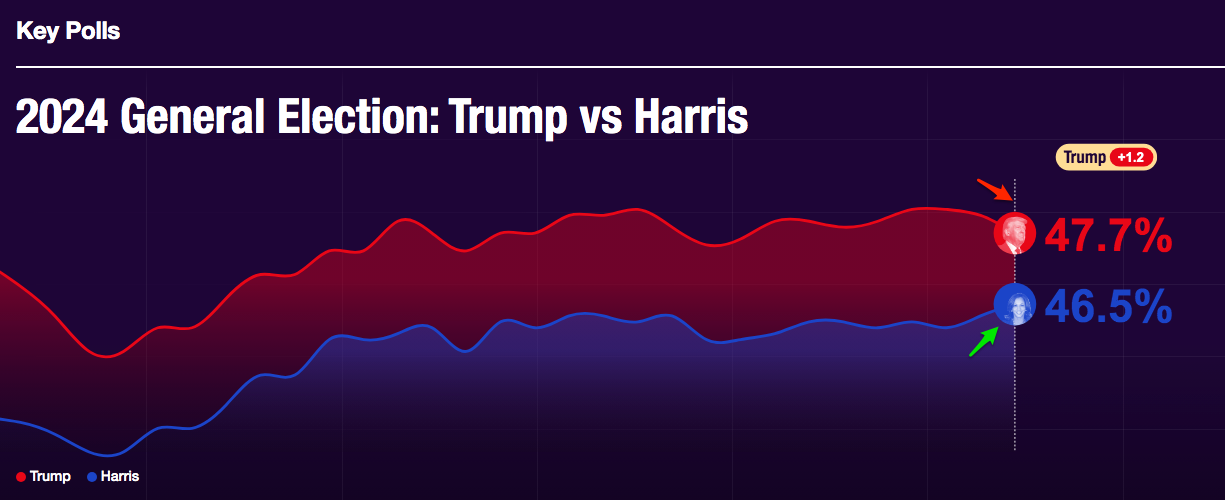 Trump não tem estado a descer nas sondagens, é Harris que está a subir (não esquecer o efeito de indecisos e de terceiros candidatos).