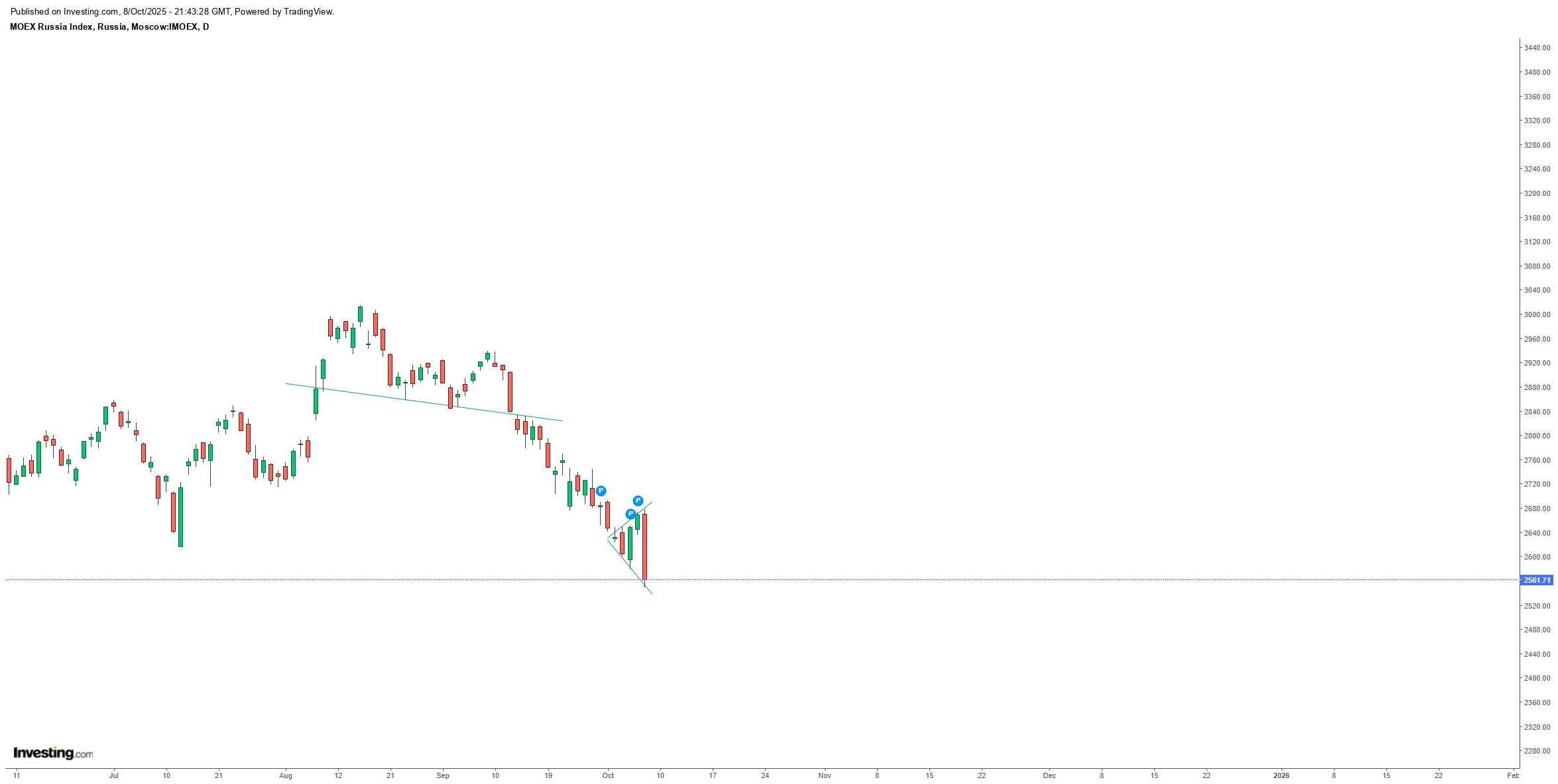 Desce mais de 3%. As sanções da UE, aprovadas a 12 de setembro, parece terem dado cabo da bolsa russa. Não foi preciso as sanções do Trump que nunca chegaram apesar das ameaças desde abril