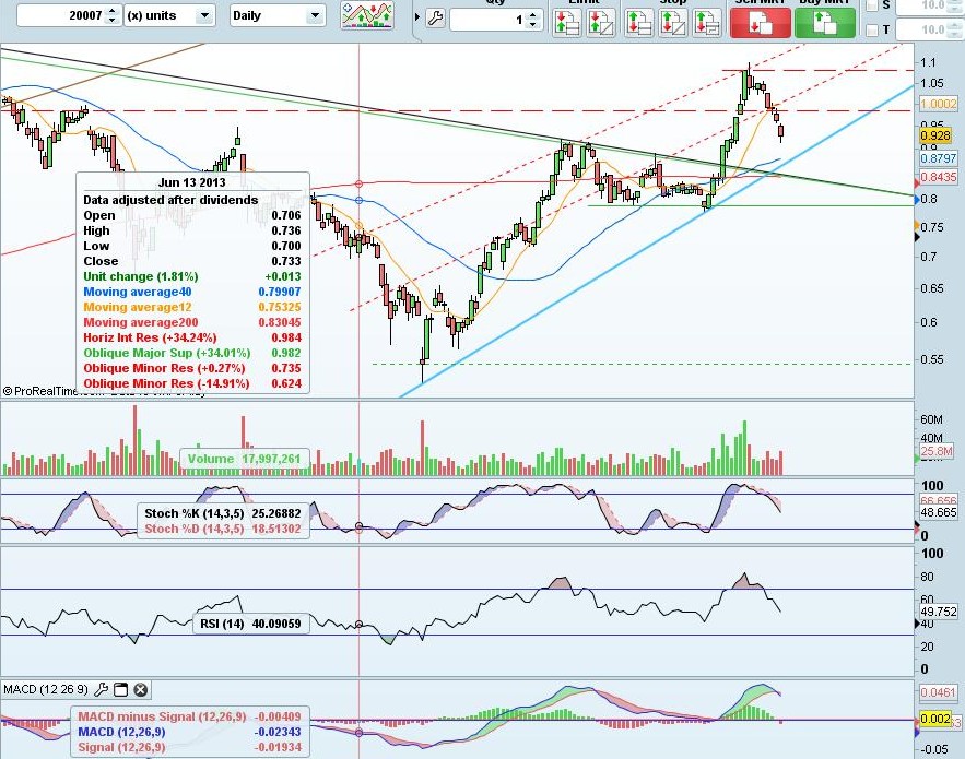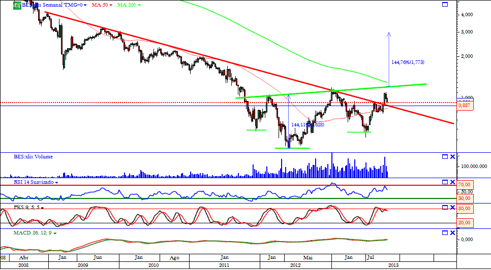 Reentrei hoje no Bes depois de ter saido a 1 euro por ação. Razão: ter batido no importante suporte dos 0,91-0,92 e ter ressaltado. Objetivo: 1,15.