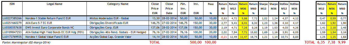 Depois com o tempo, se quiseres, ias rebalanceando e juntando mais fundos. Neste momento, 500 EUR, 5 fundos, é suficiente, tens acções no misto e no fundo de acções, tens obrigações de risco (HY) e obrigações de qualidade. No final da imagem, estão 3 colunas, que seriam os retornos, que terias no passado, baseados na informação da Morningstar em 02/Março/2014, retornos esses, brutos.