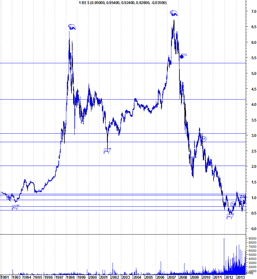 um dia destes qd referenciei que o BES vinha a bater minimos todos os dias uma pessoa do forum quase me chamou de terrorista do forum..enfim posso dizer que ganho qd a maioria ganha e perco qd a maioria perde....posso ate dizer que ontem decidi entrar no bes caso este hoje tivesse um ligeira melhoria, no entanto vendo o estado da banca e da europa,,,,estou outra vez pessimista anulei agora uma ordem de compra a 0,91....pois pelas 14:30 as coisas nao vão melhorar penso eu,, o lote de compra a 0,103 no bcp está a estacancar a queda da banca por agora...vamos ver se aguenta!
