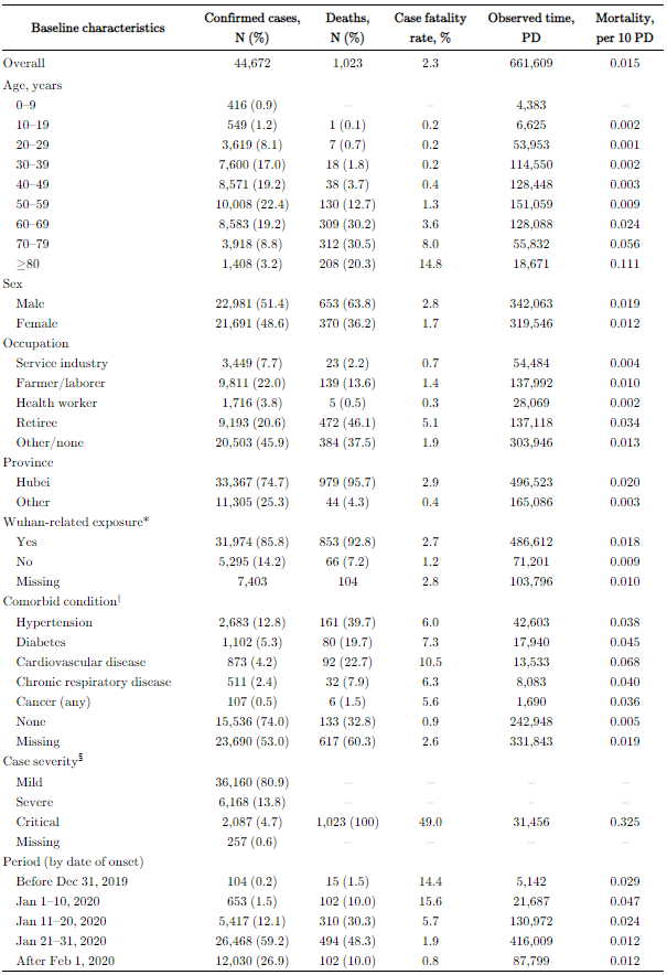 O relatório baseia-se na análise de 72,314 casos documentados na China até 11 de Fevereiro, dos quais 44,672 foram confirmados laboratorialmente, dos quais 13.8% evoluíram para severo e 4.7% evoluíram para crítico (sendo que cerca de metade destes morreram). Em anexo a tabela principal do relatório que resume os principais dados.