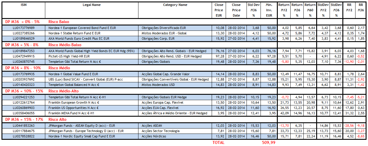 CoimbraPT Escreveu:Está feita a minha análise de fundos. Começo por referir que tive em consideração cada um dos fundos de forma independente, sem pensar em carteira (uma vez que se pretendia os "melhores" fundos por categoria). O meu foco foram fundos low-cost com UP < 100€.