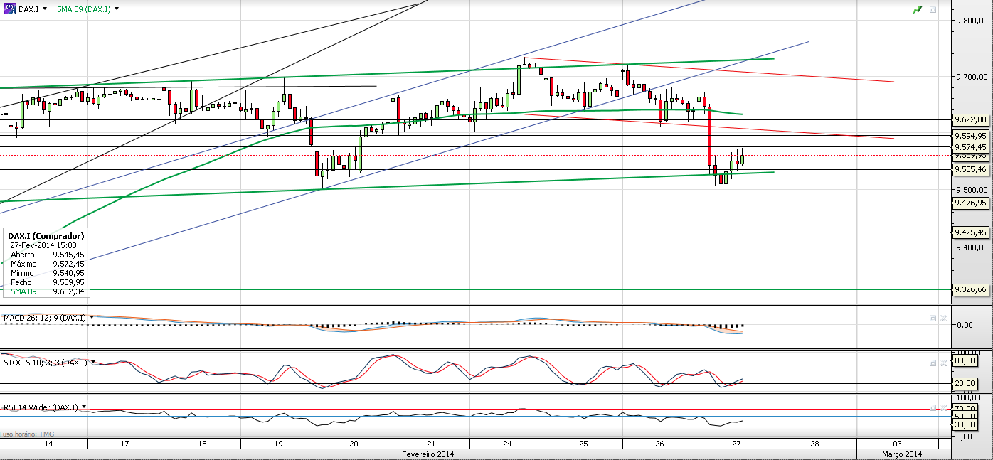 Não pude acompanhar algum tempo e deixei um stop de garantia de lucro nos 9550. Agora quando cheguei verifiquei que fui stopado. Continuo com sentimento bearish. É possível que suba um pouco mas é uma questão de tempo. Vou deixá-lo subir um pouco e cansar-se. Terei que ver qual o melhor momento para lhe aplicar mais um curto. Como habitual reportarei aqui os trades que irei fazendo no DAX.
