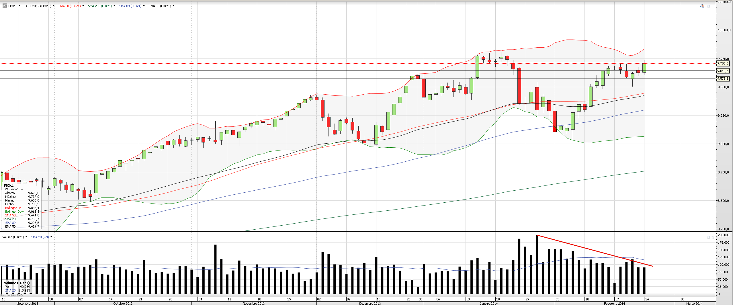 O volume dos futuros do DAX tiveram abaixo dos 90K. Tivemos mais volume (ligeiramente acima dos 100K) nos dois dias anteriores que tivemos um pullback. Não quer dizer que não chegamos até aos 9800 (duplo topo), mas deixa-me de pé atrás o decrescente volume.