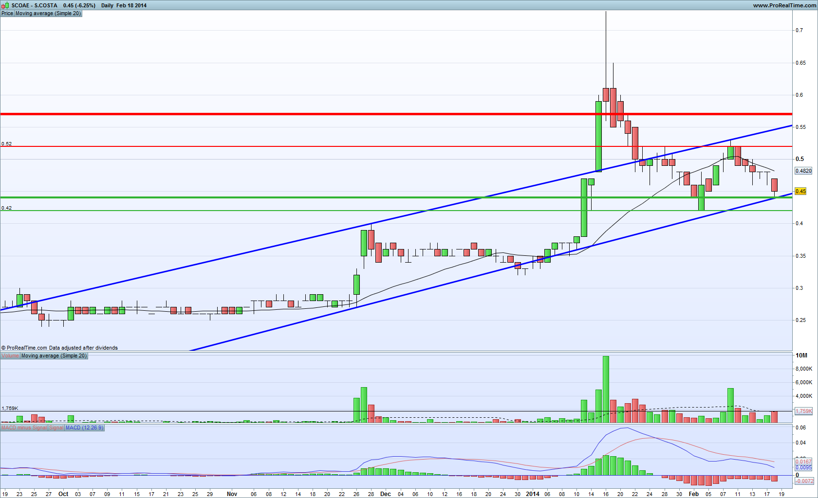 Apesar de um dia horrível para a S. Costa o suporte de CP dos 0.44 parece ter sido suficiente para segurar a acção por agora, tendo ela fechado a 0.45, também toca no canal ascendente que desenhei, porém não tenho a certeza se o mesmo está bem figurado e portanto se a análise do mesmo tem algum significado. (help me! :p)