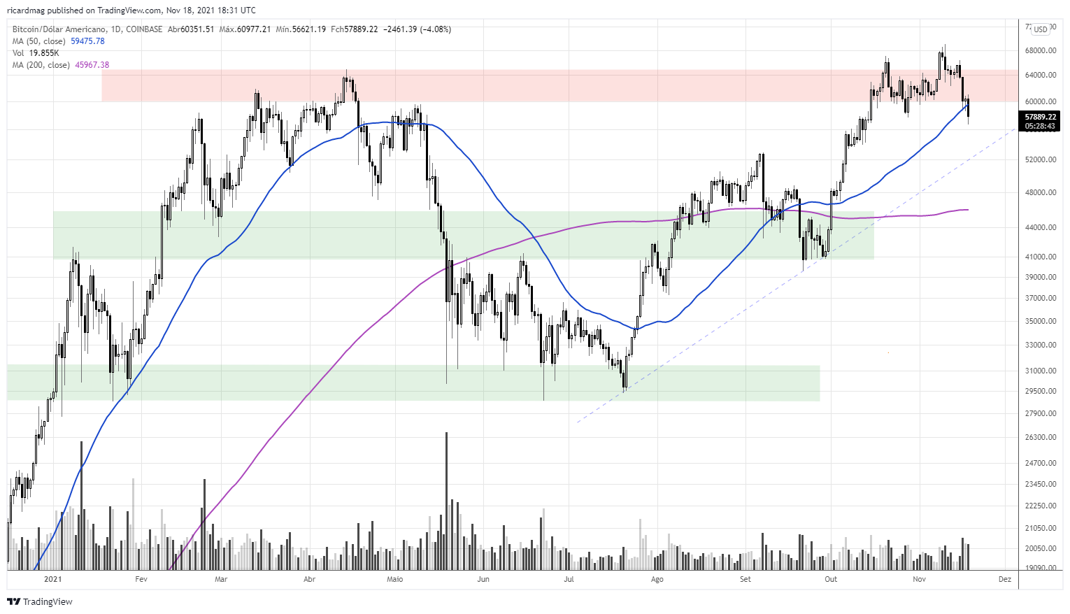 Hoje. em pleno Novembro 2021, Bitcoin caiu 22,9% dos máximos históricos ($57.204)...e agora? Cai mais 30% ou sobe a "rimar"?