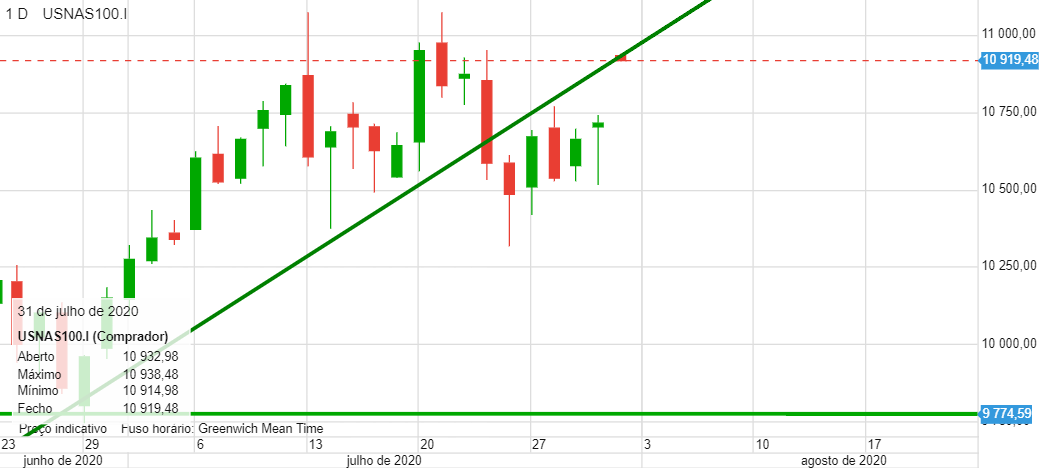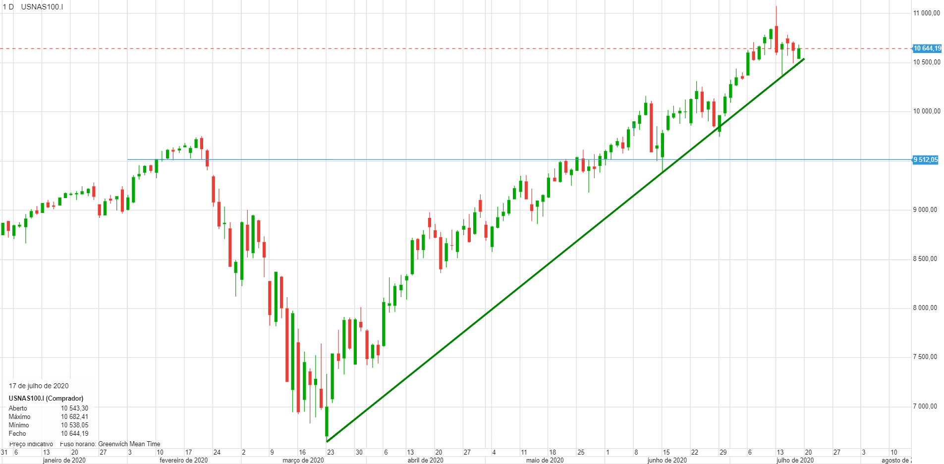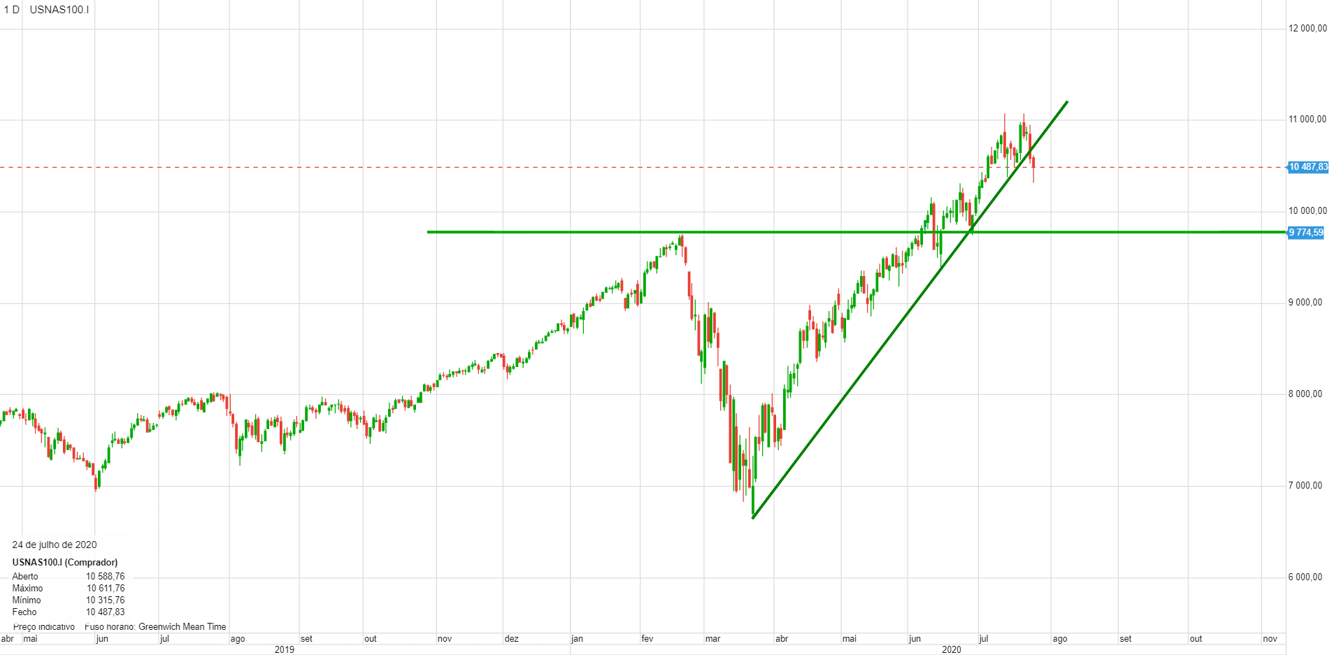 O nasdaq 100, depois de uma vela horrorosa, tem suporte na lina de tendencia ascendente que estará situada na região dos 10400.