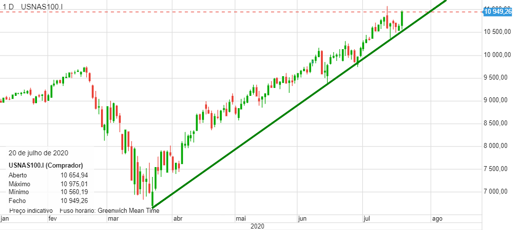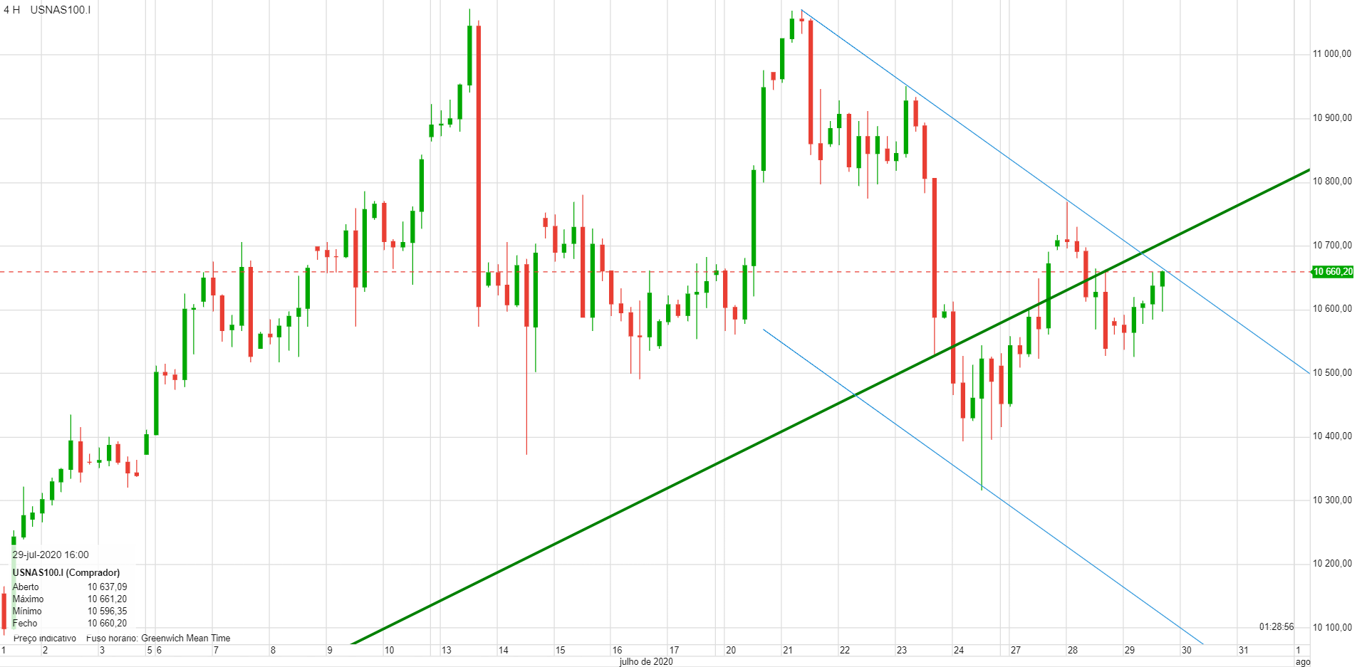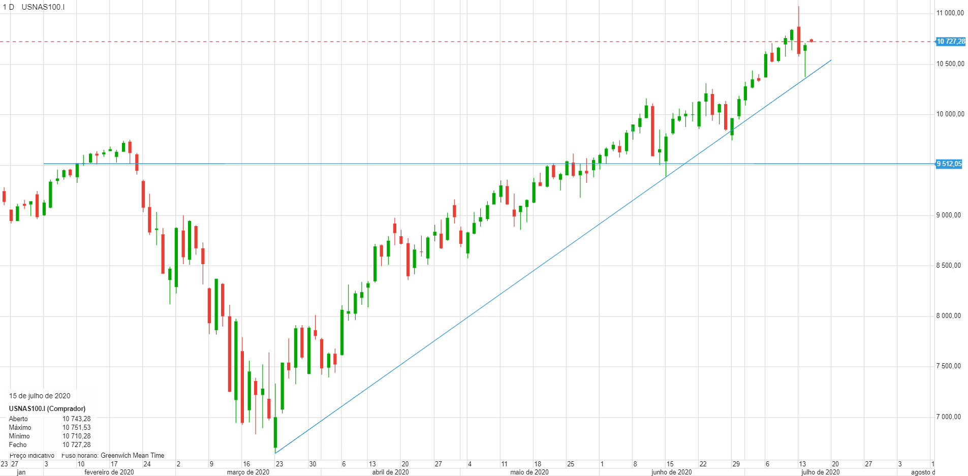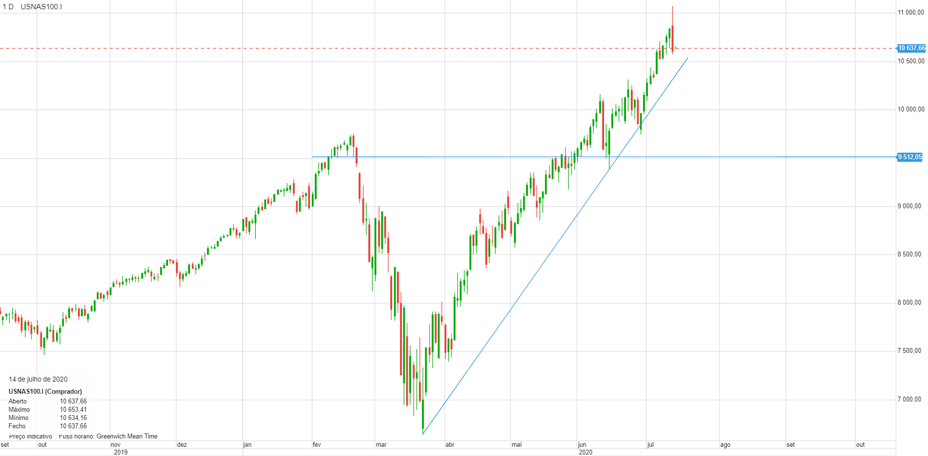 O nasdaq 100, depois de uma vela horrorosa, tem suporte na lina de tendencia ascendente que estará situada na região dos 10400.