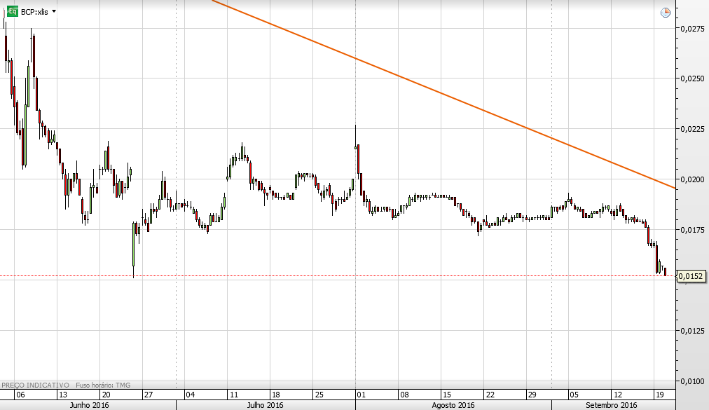 Hoje o BCP testou o seu mínimo histórico, 0,0151 euro, tendo cotado a 0,0153 euro.