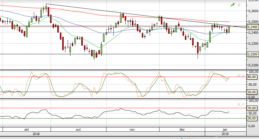 hoje consegue recuperar até á LTD á boleia do setor bancário europeu com visível fraqueza e inferior subida . terá dificuldade em ultrapassar este nível dos 0.25 e abaixo dos 0.2390 poderá visitar níveis bem inferiores e até possivelmente em fevereiro voltar a visitar a zona 0.22.