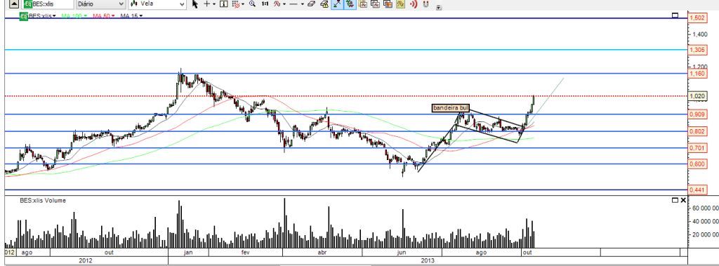Se me a minha ousadia não for inadequada, eu denoto alguns indicadores que me levam a crer que a acção ainda tem uma relativamente boa % a valorizar. A recente "golden cross", o alivio do RSI (não tanto) e o que se passou nos últimos meses de 2012 são apenas algumas. Presumo que se fixará em torno do 1,00 €, já referido como psicológico, mas só por uns dias.