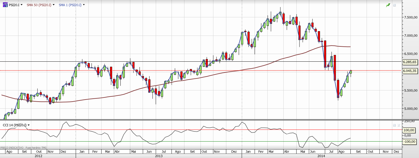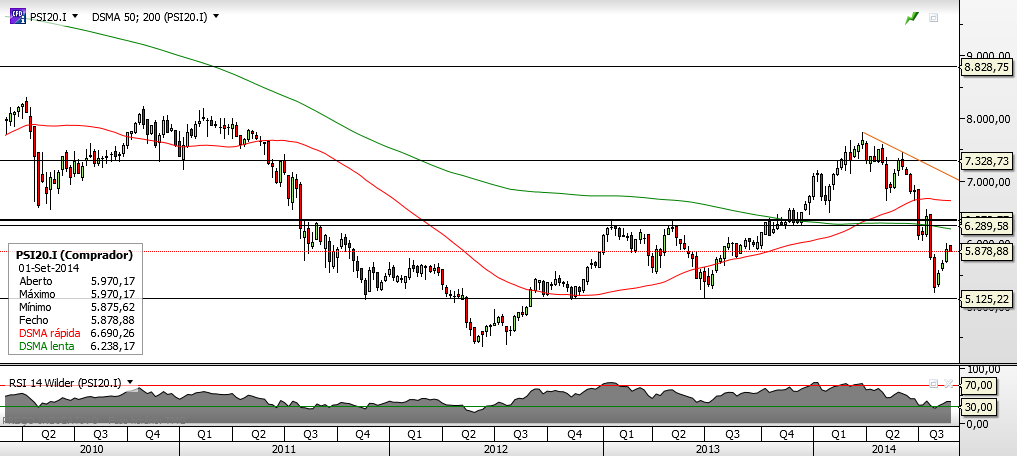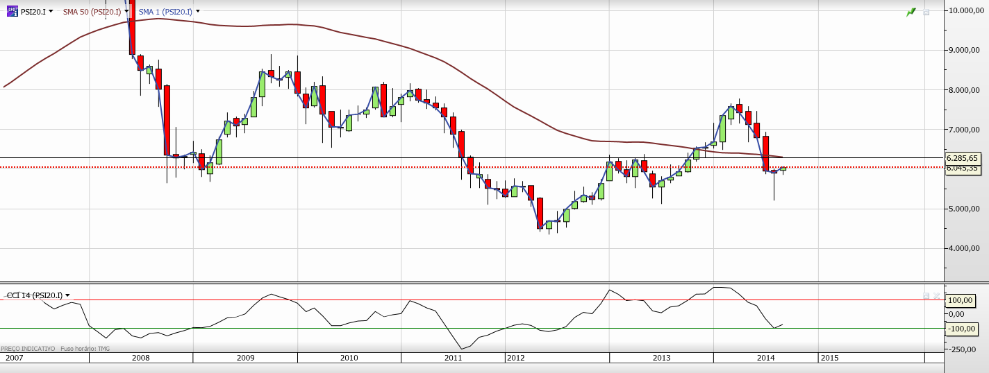 PSI consolida em triangulo sob MM50. ainda tem hipótese de ir aos 6400 mas primeiro parece-me que estará limitado numa possivel quebra desta consolidação até forçar a MM50. isto é, mais subida no muito curto prazo deverá ser bloqueada na zona dos 6100. dito de outra forma, antes de uma eventual recuperação aos 6400 deverá haver um pullback visivel no gráfico, que ainda não ocorreu. ter em mente no entanto, que no cenário de longo prazo, nada mudou no PSI e ainda continua bearish.