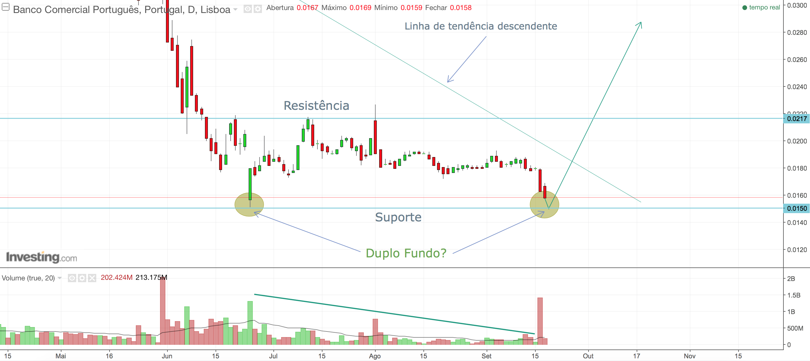 Pois, eu acabei de entrar a 0,015, não só porque não se conhece as razões desta descida, como também por haver altas probabilidades de fazer um rebound ao fazer um 2º toque nos mínimos (duplo fundo). Vamos ver se a minha intuição bate certa...