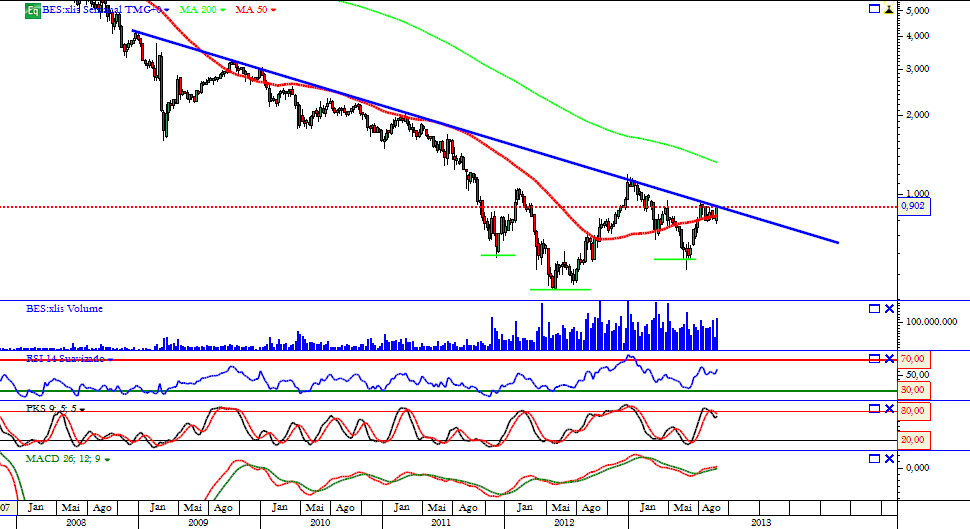 Eu às vezes até me esqueço de referir isto, mas em qualquer uma das acções da banca (BPI, BES, BCP) a ponderar uma entrada será sempre até à resistência mais significativa, neste caso à volta dos 1,15€. Também não me parece que seja desta que a banca arranca de vez para o bull mode!