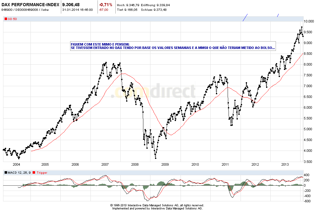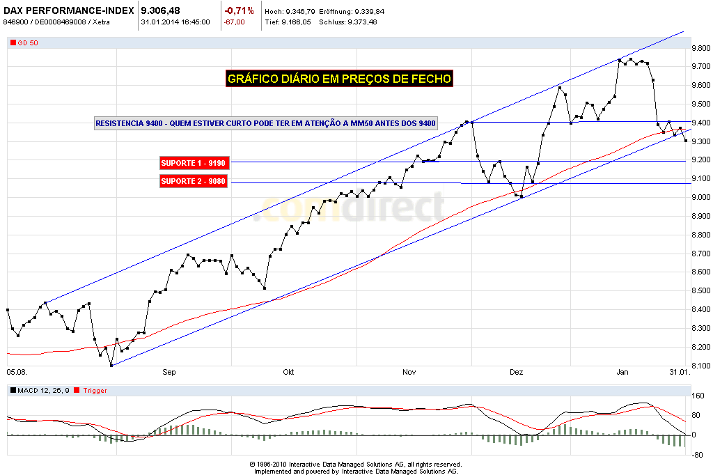 Com esta volatilidade e indecisao dos mercados, a incerteza do que se vai passar com os mercados emergentes, a diminuicao da ajuda federal e uns resultados das empresas nao tao bons como esperados, levam a que seja , para mim, impossivel de prever o comportamento do DAX. basta ver o dia desta semana em que abriu com um gap up com cerca de 100 pontos e acabou estatelado c'a em baixo!1
