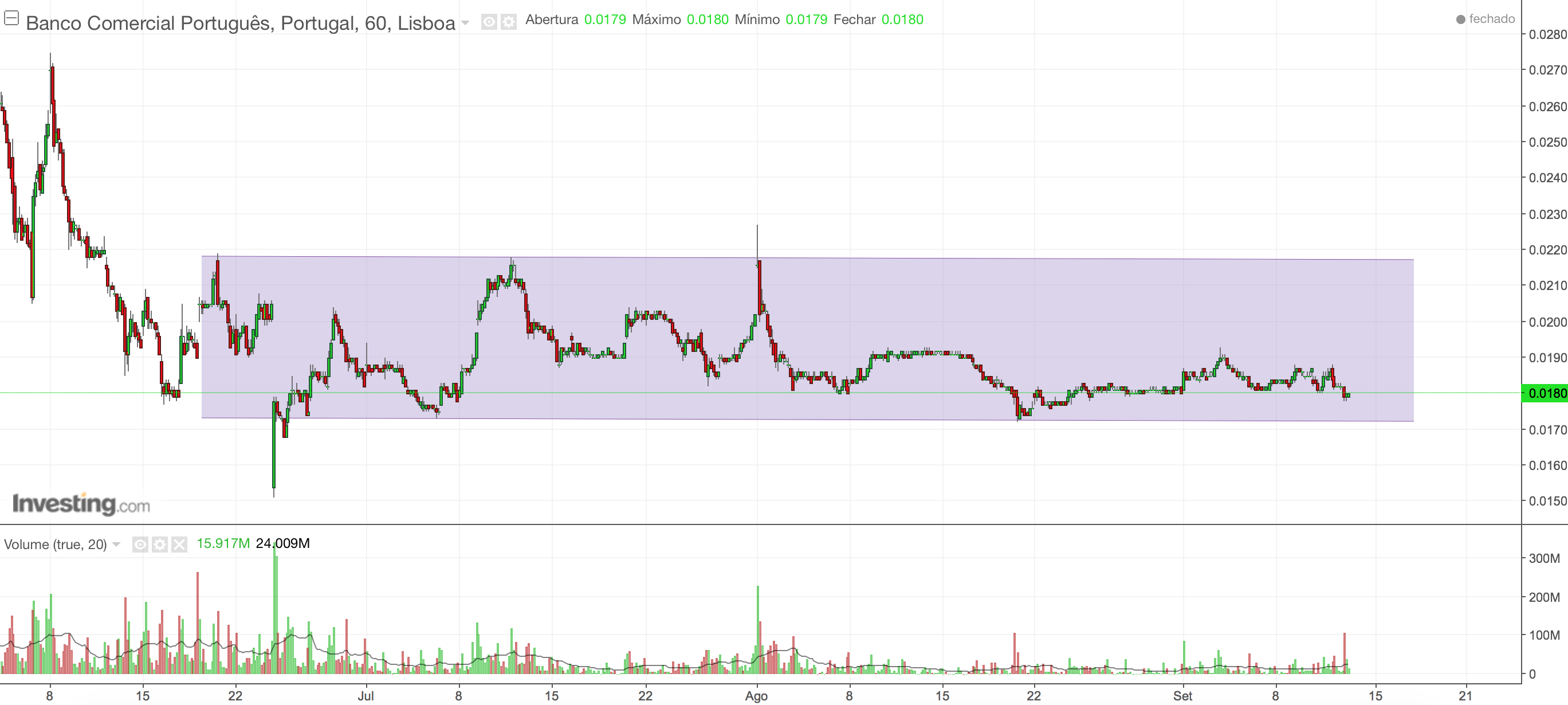 ativo Escreveu:Fecho em 0,0180 euro, "em cima" da linha vermelha inferior, a qual no entanto foi ultrapassada. Para mim, isso basta como mau sinal: as linhas vermelhas não devem ser ultrapassadas!![]()