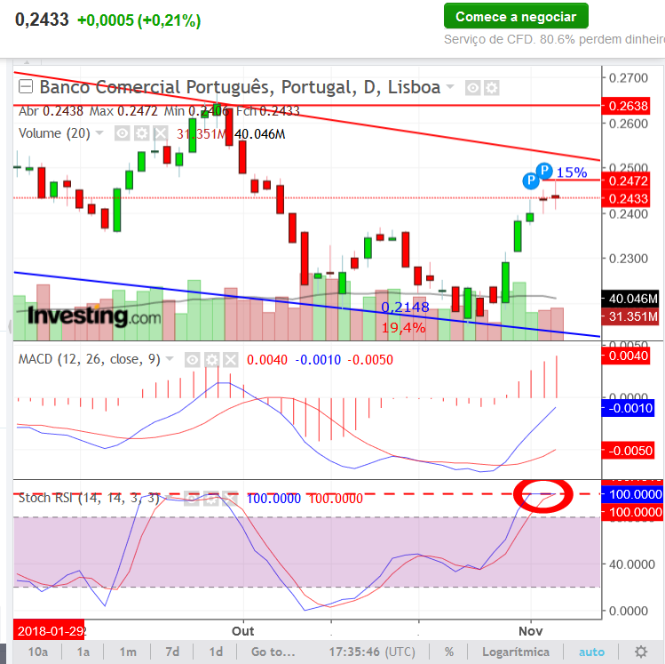 BCP está em tendência de queda há 9 sessões , depois de ter feito máximos nos 0.2580