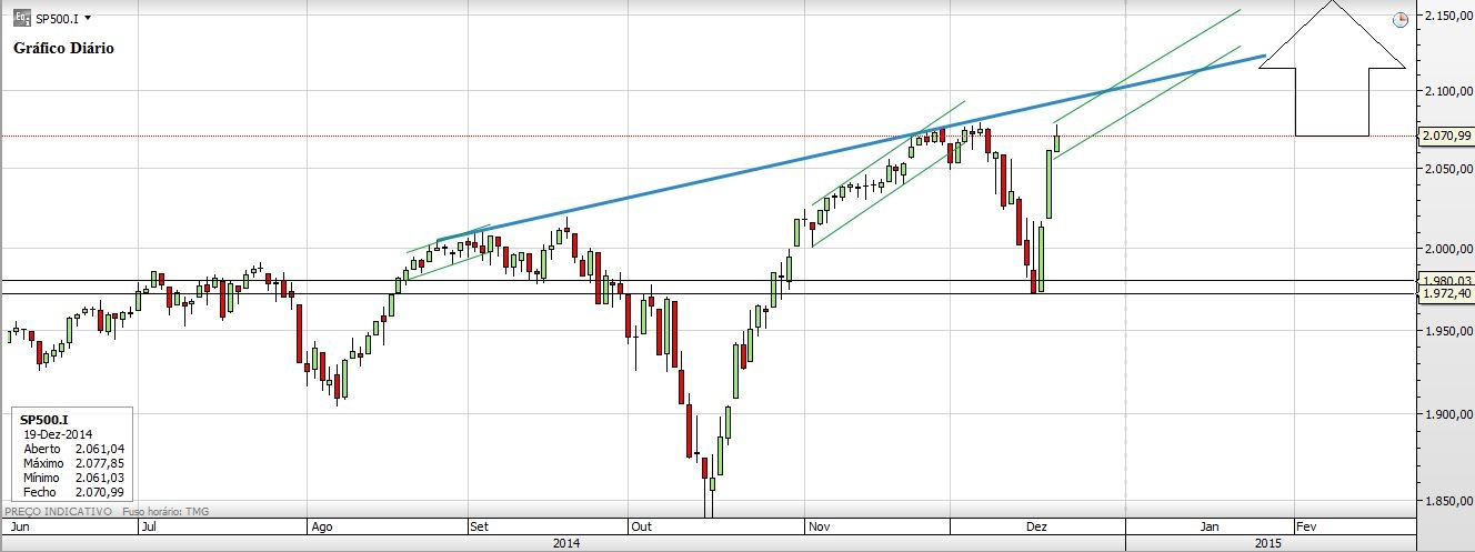 Parece-me provável que na semana do Natal não aconteça a tal correção que, passadas 3 sessões de subidas já muitos começam a ansiar... (nem na semana do ano novo). Mas isto nunca se sabe... O que eu gostava agora era de uma bandeirinha vulgo "Bull Flag" para um ataque aos 2100/2155 e para isso o Preço até poderia ir aos 2050. Mas parece-me mais provável o cenário que indico de um pequeno canal ascendente até lá acima, como em situações recentes aconteceu...