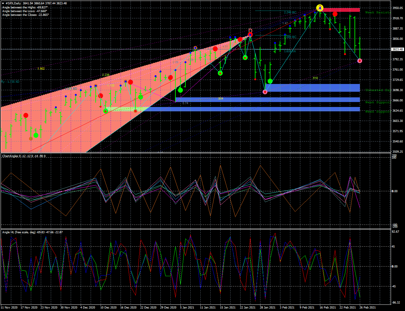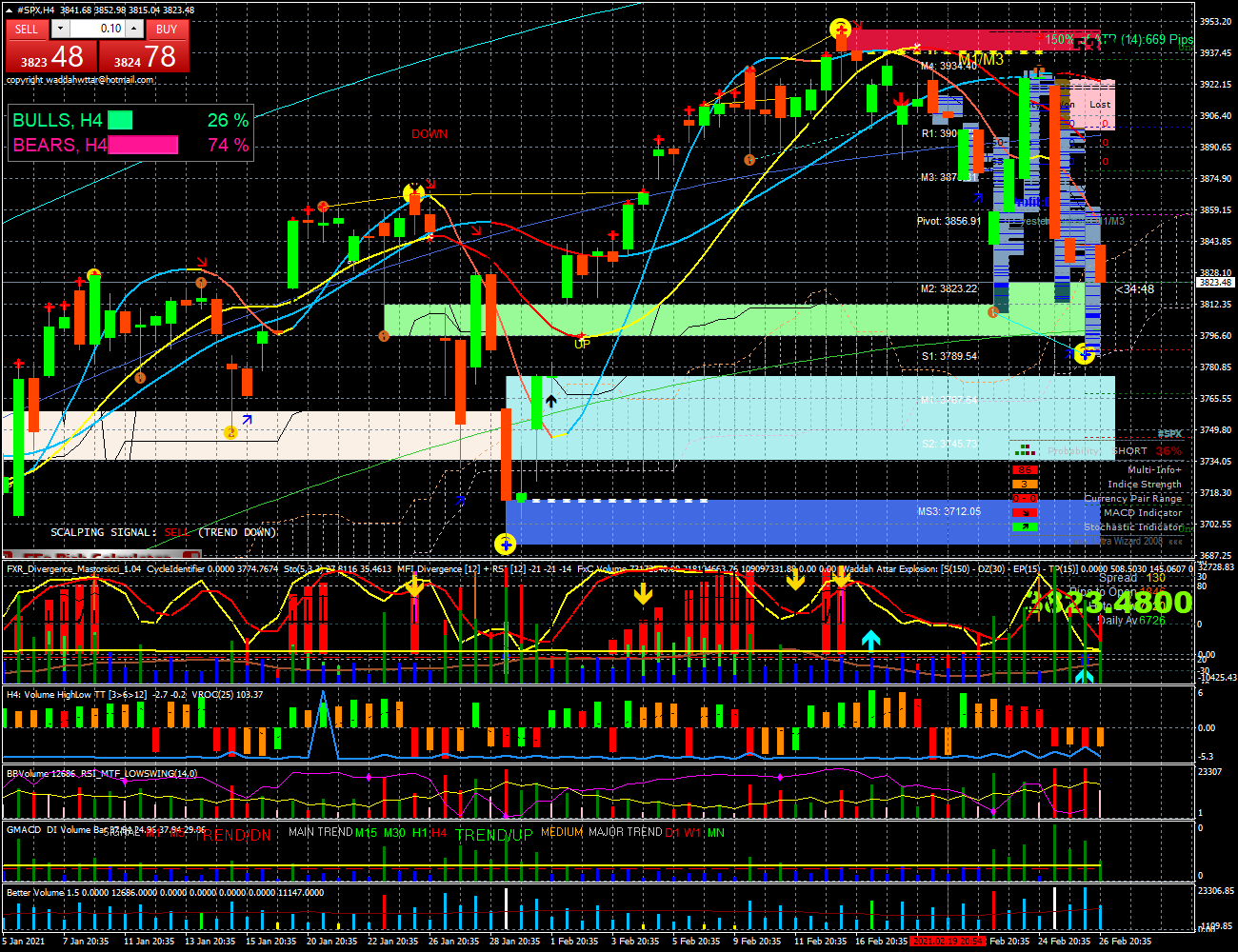 O SP500 esta numa tendencia de baixa tanto no time D. como 4H; no diario tem suporte 3700 pontos, tambem o volume o indica 24K subida e 35K de descida, no timeframe de 4H tem suporte 3665, e volume na descida 22k e 13k, na subida 16k., no horario esta indeciso, mas a tendecia diaria manda, volume subida 5k, e descida 5k, aqui a força dos touros/ursos esta equilibrada.l, deixo graficos geral c/indicadores D.4H.1H. bem como graficos de Harmonics.