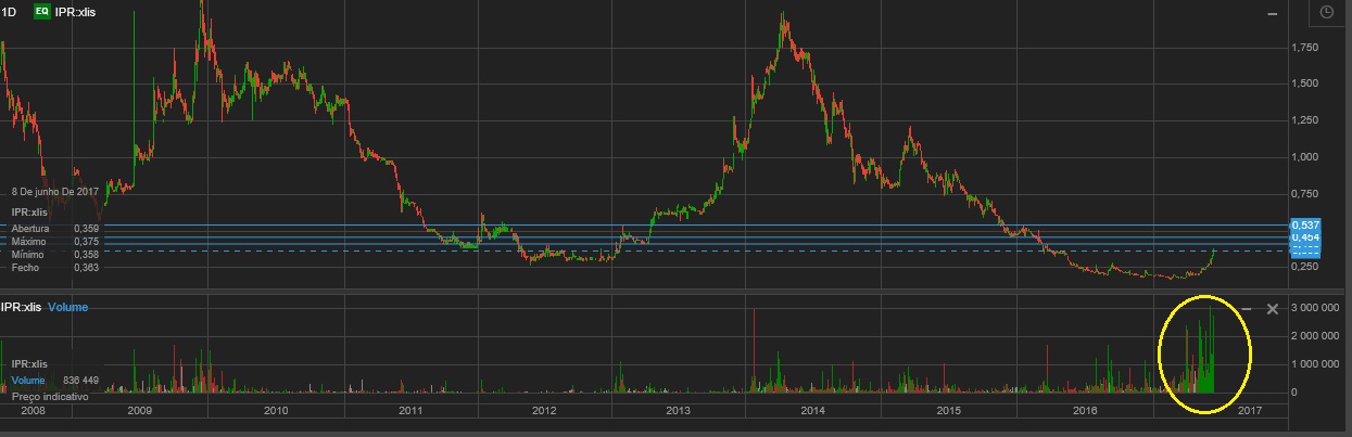 Ora bem, eu percebo a malta dos fundamentais que anda um bocado admirada com tanta subida. Eu não conheço as contas, mas olhando para os últimos comentários, se é verdade que a Impresa tem uma dívida de quase 100x as suas receitas anuais, não está de muito boa saúde. Mas serão esses mesmo os números? Não tenho tempo nem sei o suficiente para confirmar. Portanto, eu olho para as acções graficamente. E o que vejo é um volume absurdo e um claro fundo. Tem tudo para ser uma inversão de tendência. No que estará baseada? Não sei. O que é que os investidores que representam este volume enorme sabem? Não sei. Mas aposto que não são só loucos sem noção de gestão de risco a compor todo este volume comprador. Deve haver alguma coisa a fundamentar estas compras que não são os relatórios e contas da empresa. A quem interessa saber isso, percebo a desconfiança. A mim não me interessa sabem. Os gráficos chegam-me.
