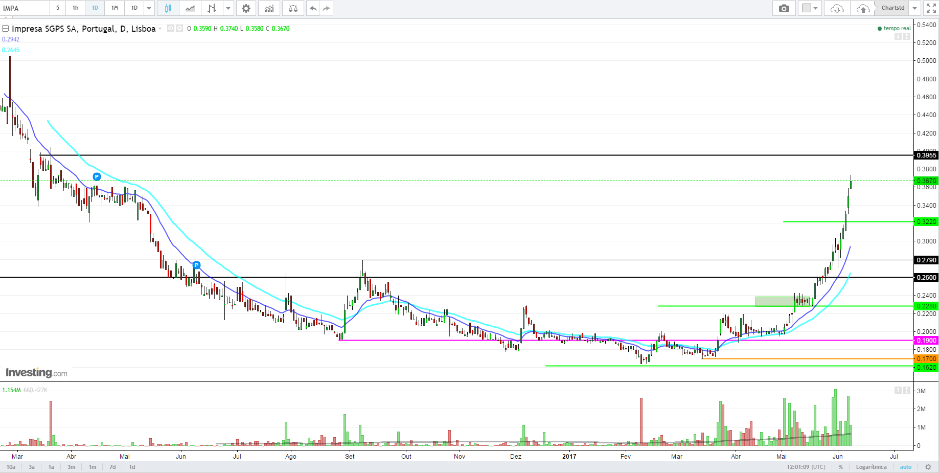 Dinamicadomercado Escreveu:A impresa poderá ir até aos 0.3955€ , o titulo está a precisar de descansar após este movimento em linha recta.