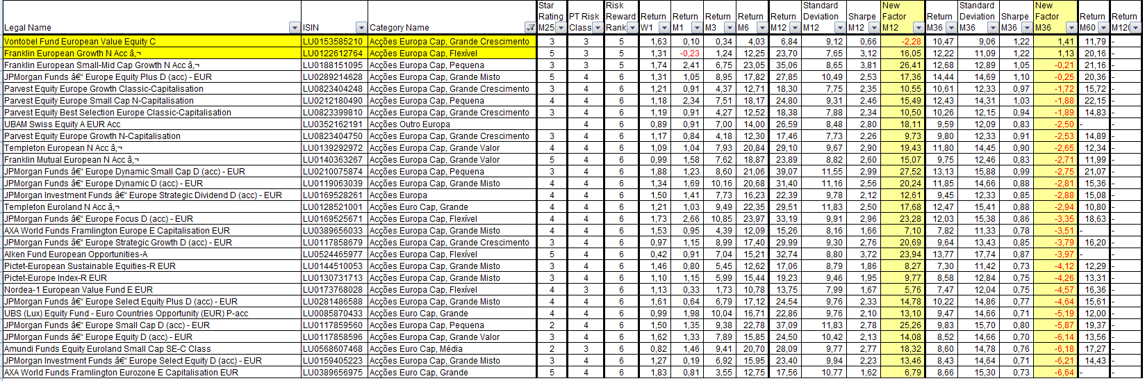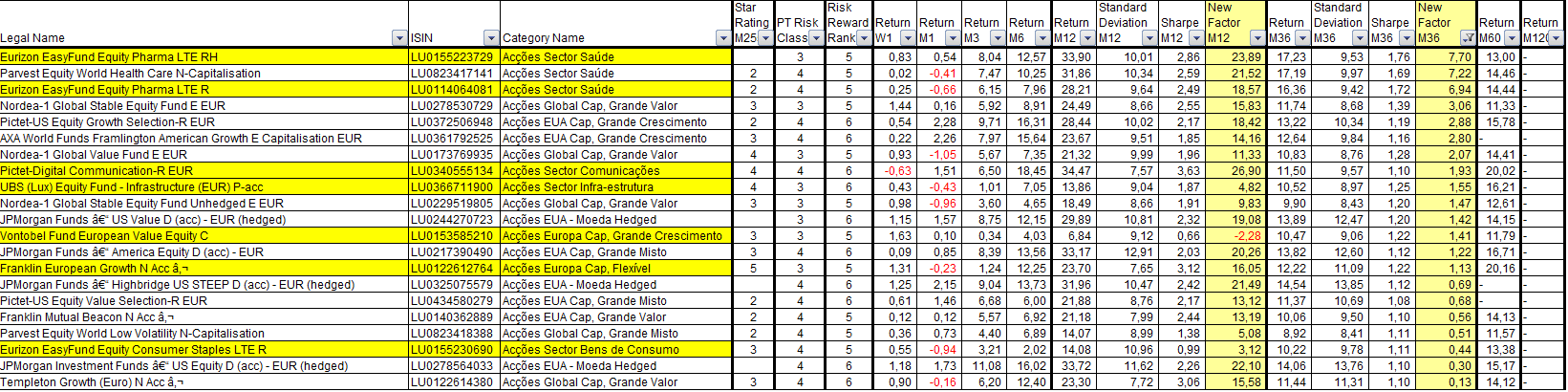 @Chico, tive a "brincar" 1 bocadinho com o teu Excel, ordenei os fundos através do "New Factor M36" de forma decrescente e depois filtrei os que eram igual ou superior a 0. Pintei a amarelo os fundos já falados aqui.