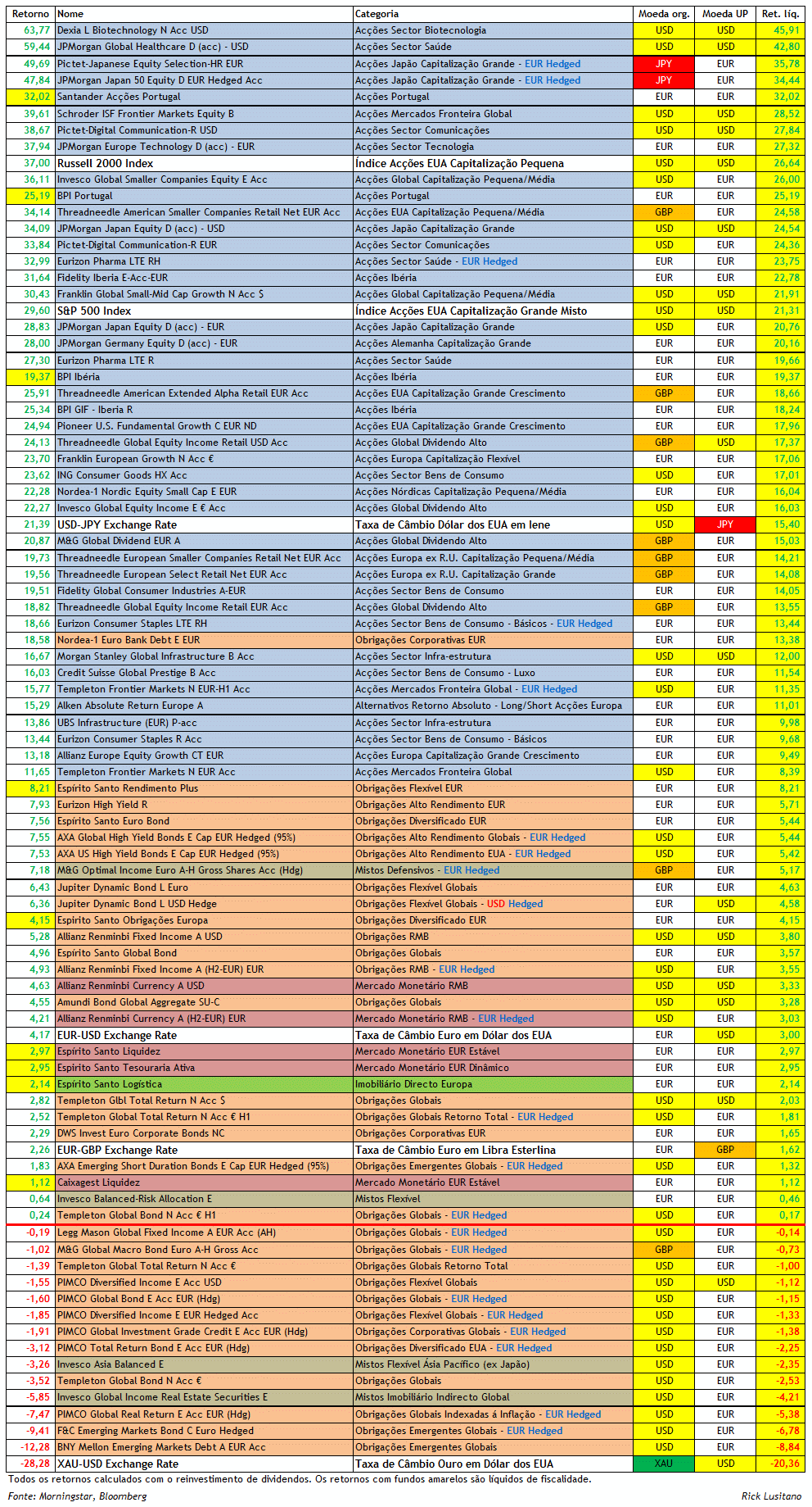 Os melhores fundos em retornos líquidos de impostos, visto que tem os fundos e as referências em várias moedas misturadas, acrescentei uma nova coluna do lado direito, com as moedas das classes de cada fundo. Seguido de outra coluna nova, esta com os retornos líquidos de fiscalidade (-28%), excepto nos fundos domiciliados em Portugal, que já apresentam retornos líquidos. Esta coluna inclui tanto os fundos como as referências (índices de acções e taxas de câmbio), líquidos de fiscalidade, para melhor comparar as performances entre eles, sendo que esta coluna é está ordenada decrescentemente, daí os resultados da coluna esquerda, não estarem ordenados.