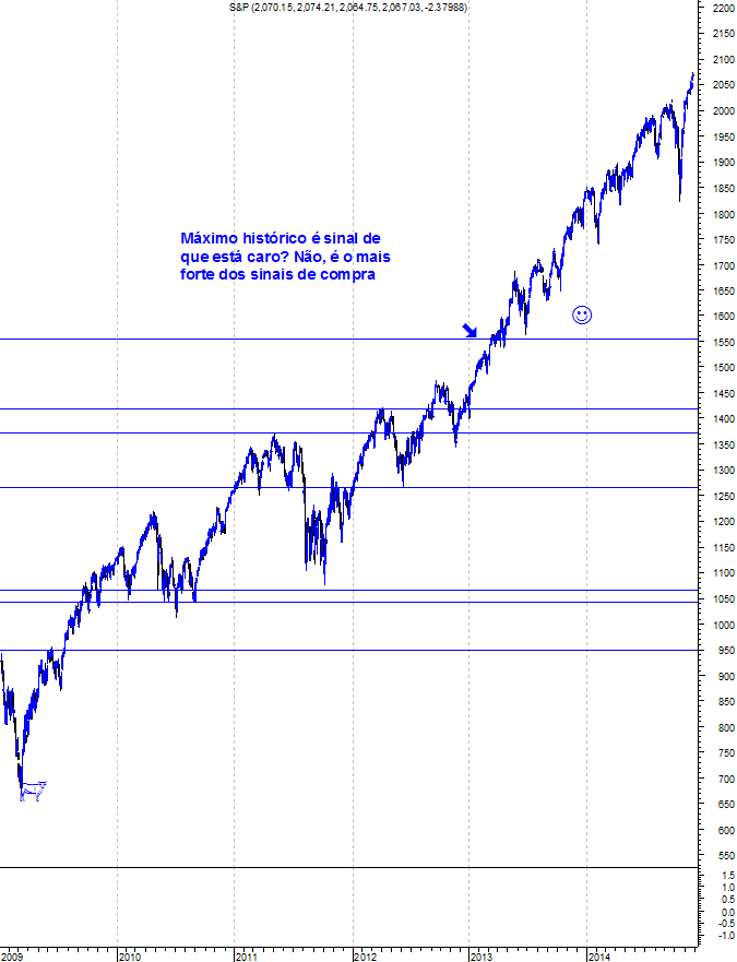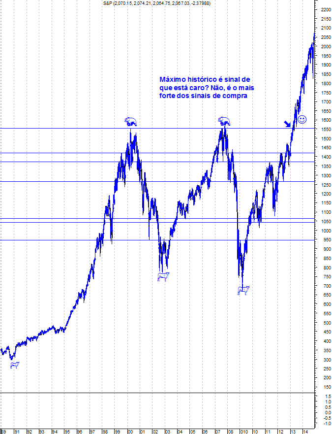 No entanto, em termos de longo prazo, o "Bull Market" permanece intocável. Quando o S&P atingiu um máximo histórico, a percepção de muitos é que estaria "caro". É normal esse pensamento mas, na verdade, um máximo histórico é o mais poderoso sinal de compra em termos de análise técnica.