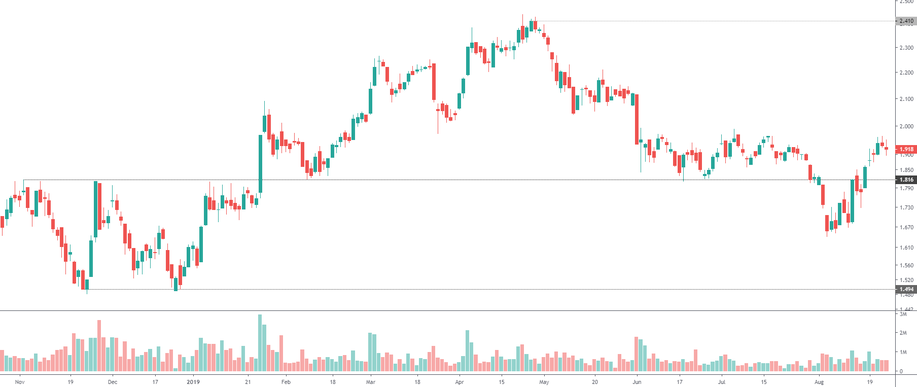 Boa tarde está em cima do referido suporte 1.80 vamos ver se o cenário muda ou se as quedas vão continuar talvez possa inverter aqui mas o panorama geral não é nada famoso vamos ver o que faz a FED e no que dão as negociações EUA- CHINA