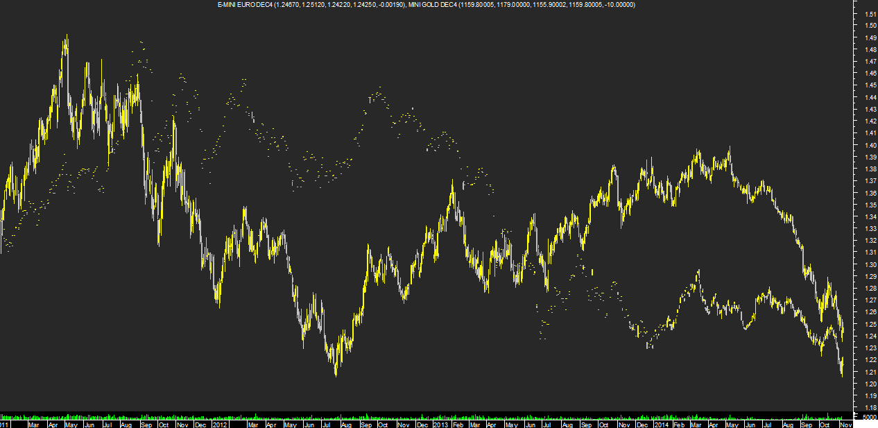 Na realidade o único ativo que varia inversamente com o Ouro é quase sempre o USDollar, o Ouro em geral funciona como refúgio dos que se querem desfazer dos dólares nos States, daí que um dos poucos ativos que poderá ter alguma correlação positiva com o Ouro seja o EuroDollar, conforme podem constatar mais abaixo.