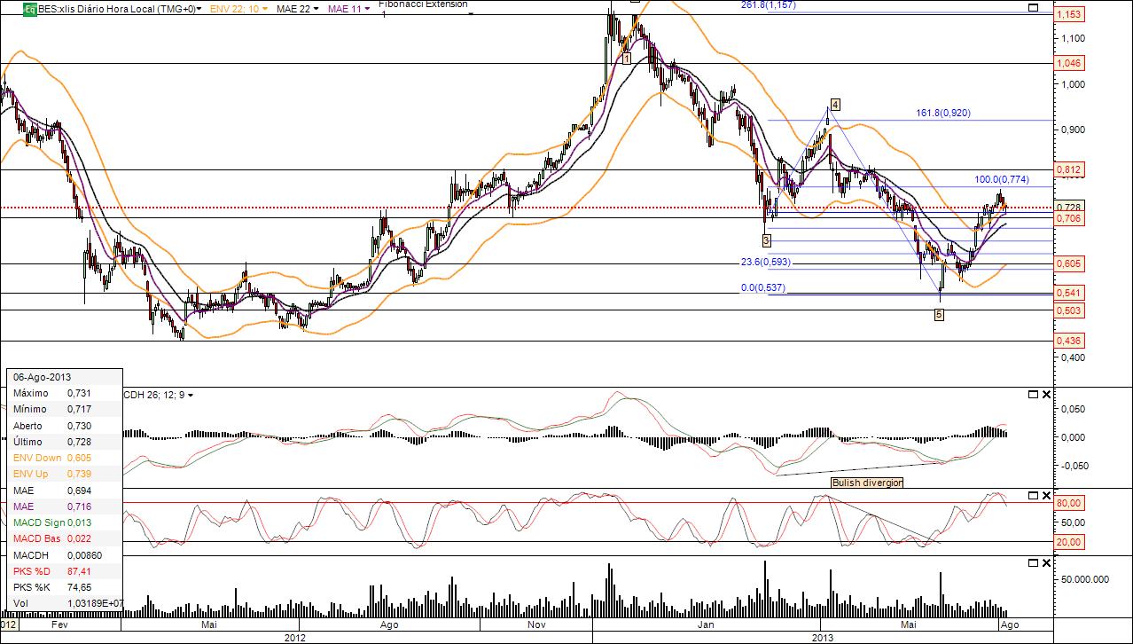 Tenho acompanhado um pouco mais o BES nos últimos dias e parece-me com força. Passou os €0,070, que aguentaram a notícia dos resultados do semestre, foi até aos €0,755, faz uma ligeira correção e após o martelo de ontem pode estar a ganhar novo fôlego.